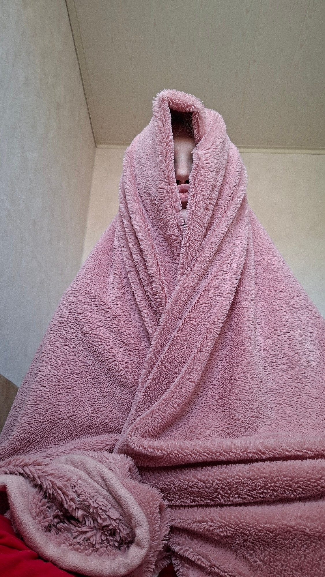 A person is enveloped in a pink, fluffy blanket or robe, obscuring most of their body except for a glimpse of their face and possibly their teeth visible through a small opening. The background shows…read more