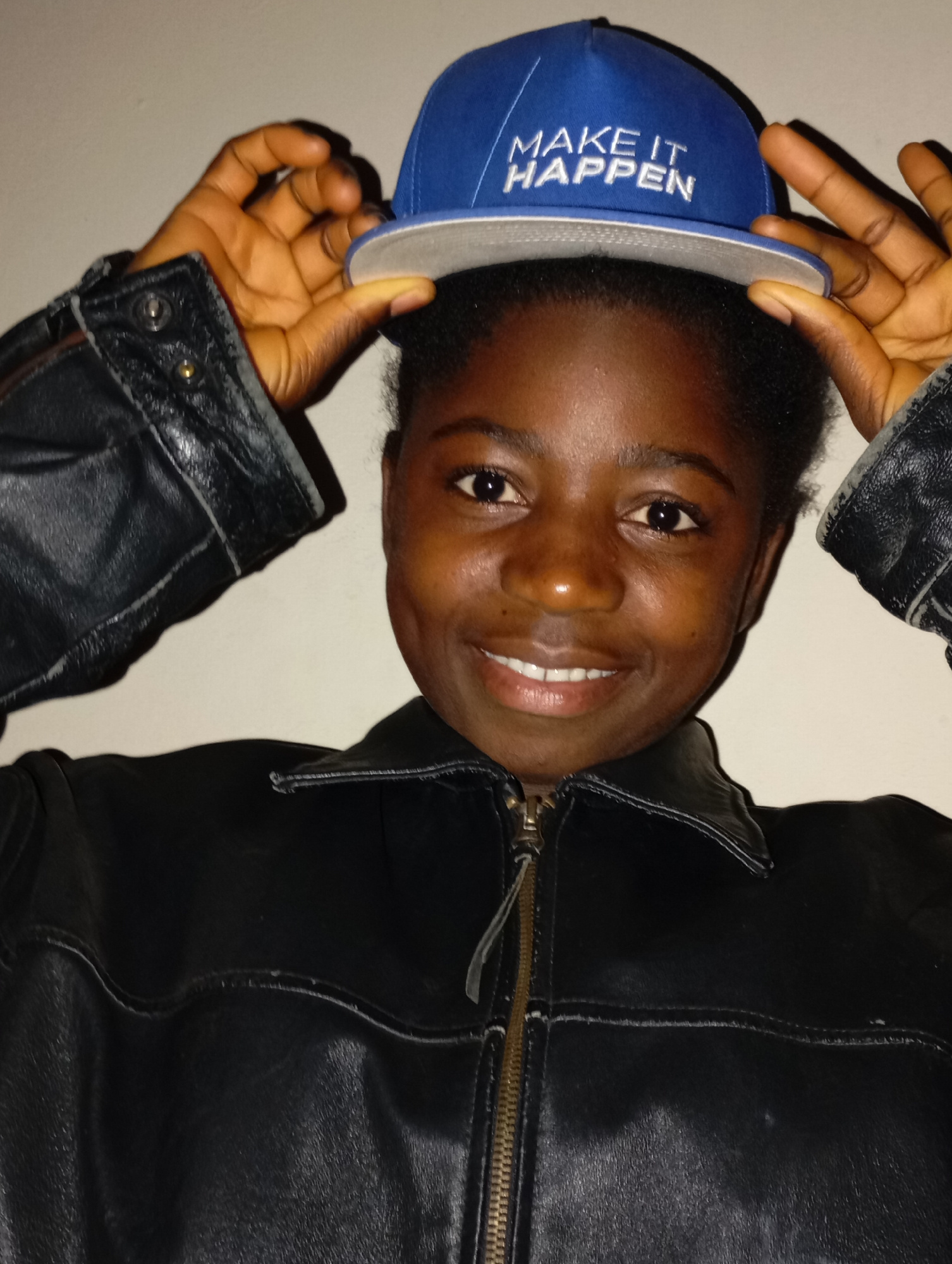 A dark-skinned woman is wearing a black leather jacket and holding a blue baseball cap with white text "MAKE IT HAPPEN" slightly above her head. The background is a plain, light-colored wall. It is no…read more