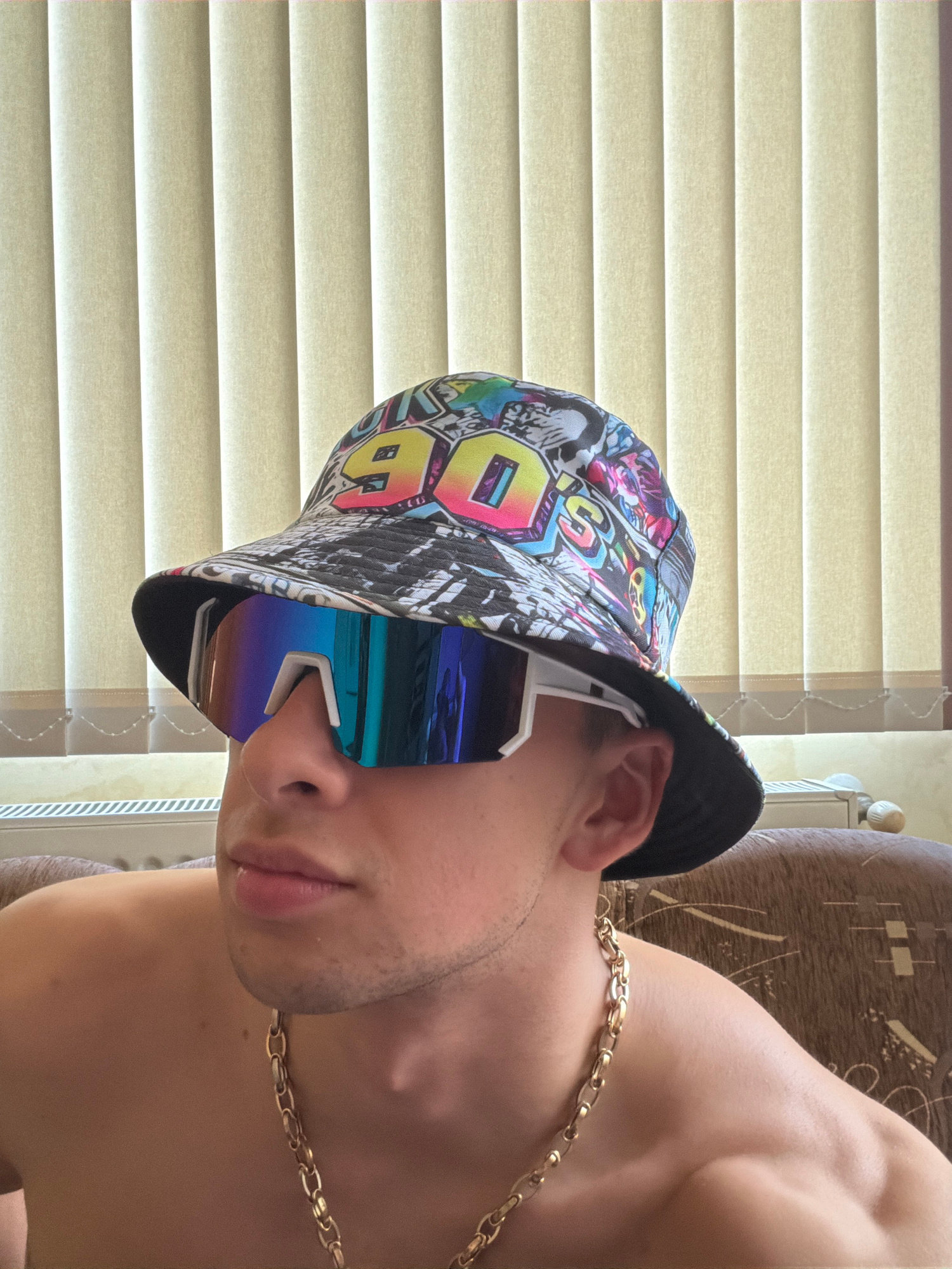 An indoor portrait-style image, rotated 90 degrees counter-clockwise, features a person from the mid-torso up, posing for the camera. The subject appears to be a young male, seen in profile with his fâŚread more