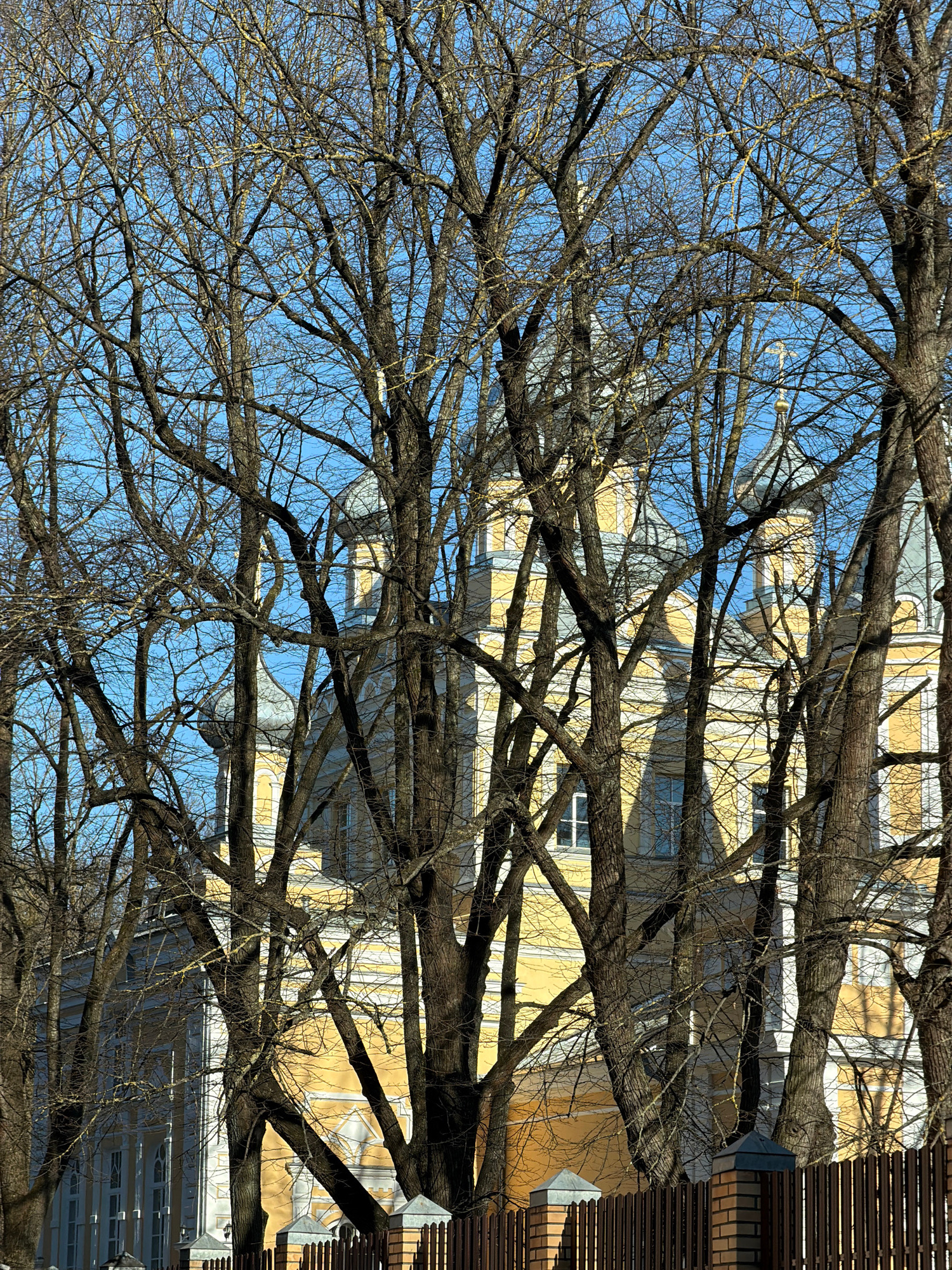 A dense network of bare tree branches dominates the foreground against a backdrop of a yellow building and a clear blue sky. The building has visible windows and architectural details. A partial view…read more