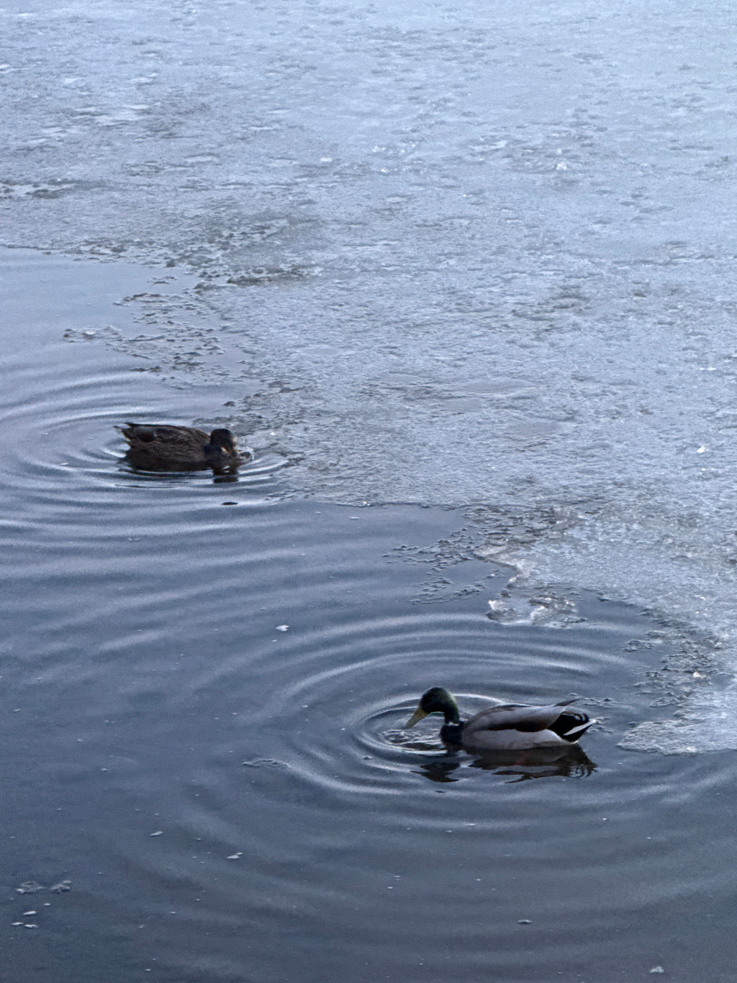 The image depicts two ducks swimming in a body of water, likely a lake or pond, adjacent to a large expanse of ice. The ice occupies the left side of the frame, showing a mix of solid and melting sect…read more