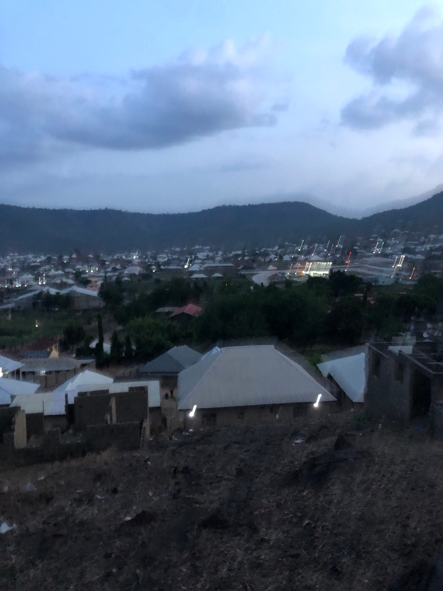 The image presents an aerial or high-vantage point view of a town or city, likely at dusk or early night, under an overcast sky. The sky, occupying the top half of the frame, is a light blue-grey with…read more
