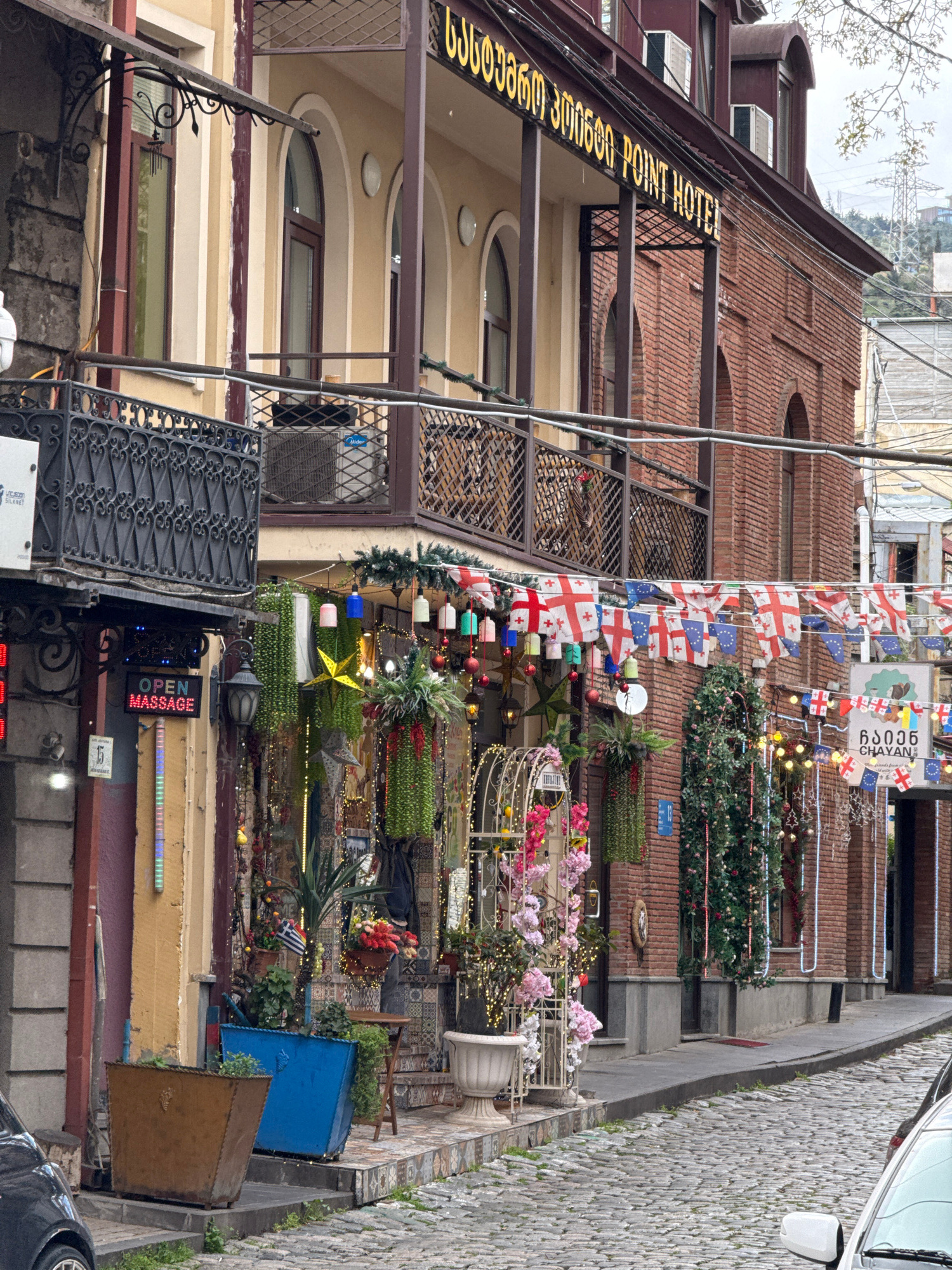 The image shows a multi-level building in Tbilisi, Georgia. A sign reads "სტანდარტ პოინტ ჰოტელ" (Standard Point Hotel) in Georgian script. The facade is a mix of tan and brick, with arched windows and…read more