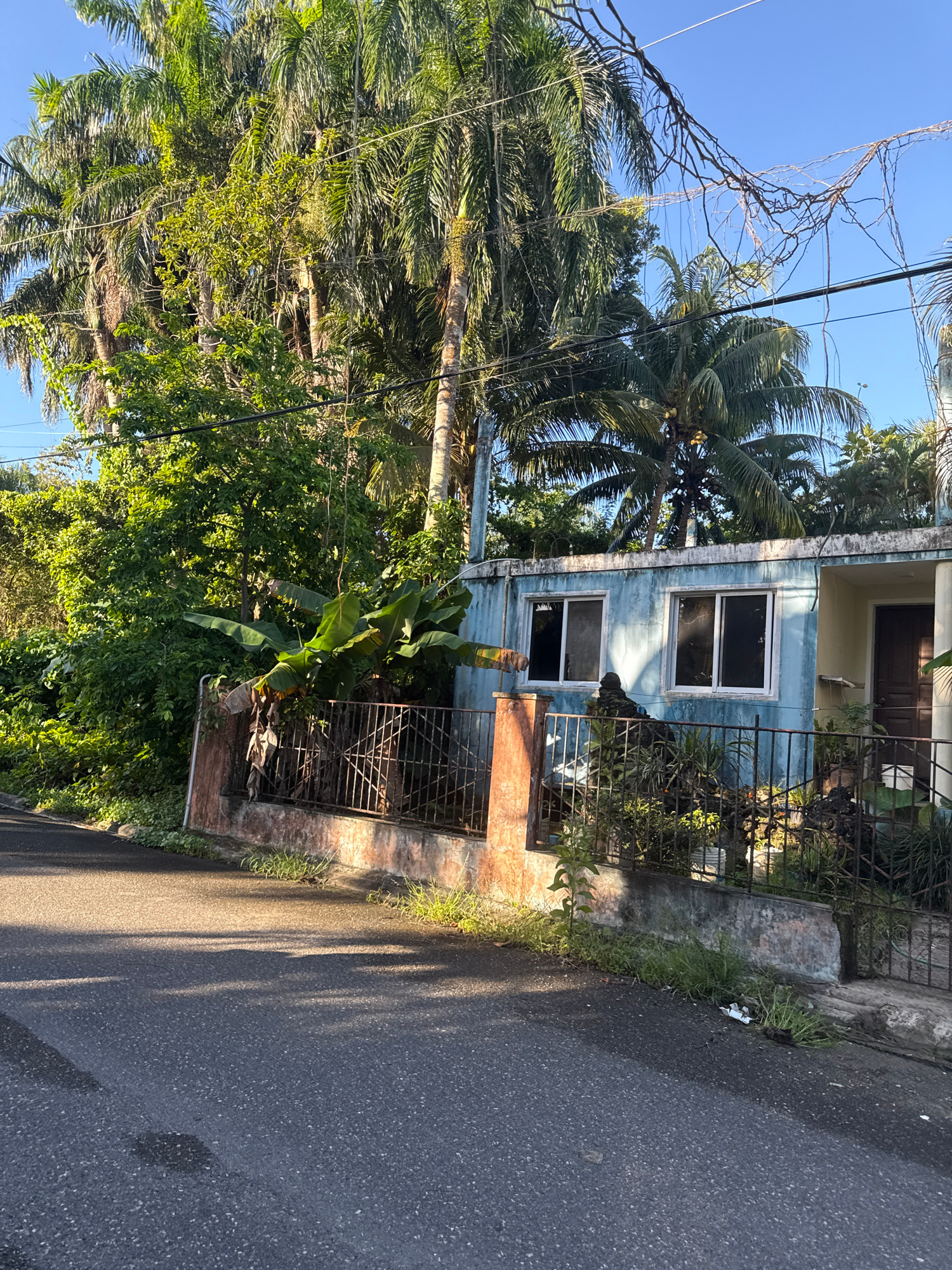 The image captures a residential street scene in Cabarete, Dominican Republic. A faded blue, two-story house with white-framed windows and an open door is visible behind a rusted, decorative metal fen…read more