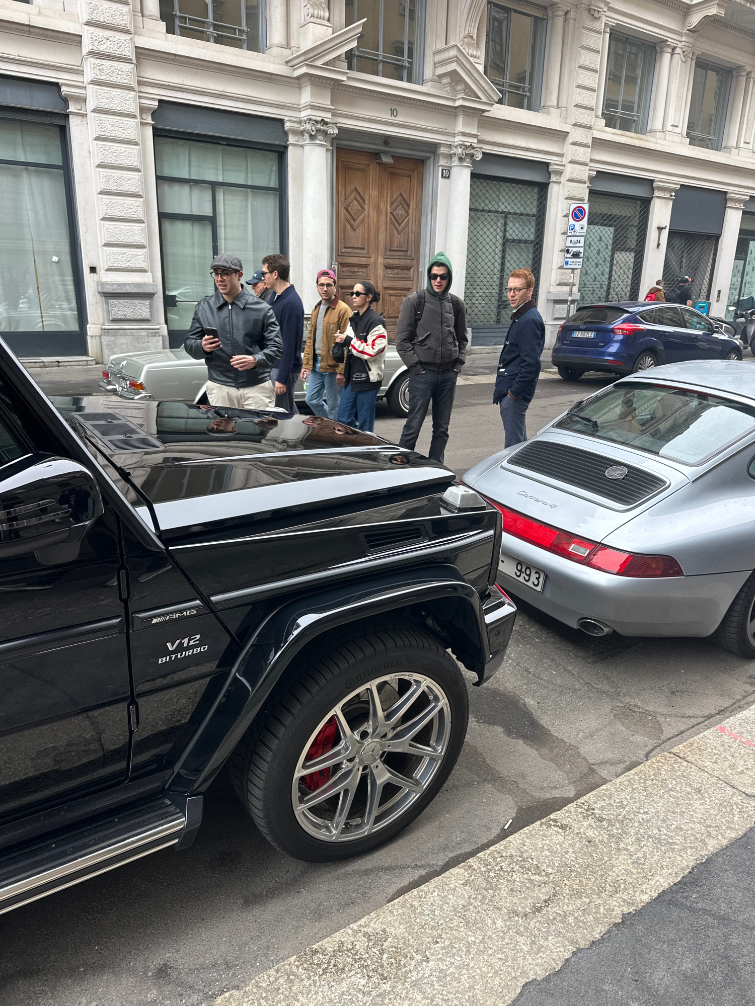 An urban street scene in Milan, Italy, depicts a group of six pedestrians and several vehicles. In the immediate foreground, a black Mercedes-Benz G-Class AMG V12 Biturbo SUV is partially visible on t…read more
