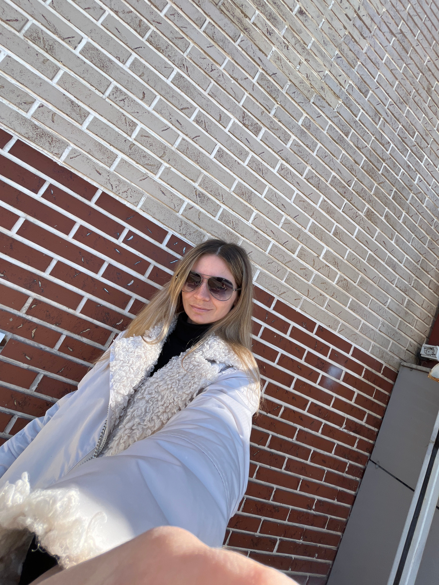 A selfie shows a woman with blonde hair and sunglasses wearing a white jacket standing on a brick walkway. The brick walkway is composed of tan bricks and red bricks. The walkway appears to be adjacen…read more