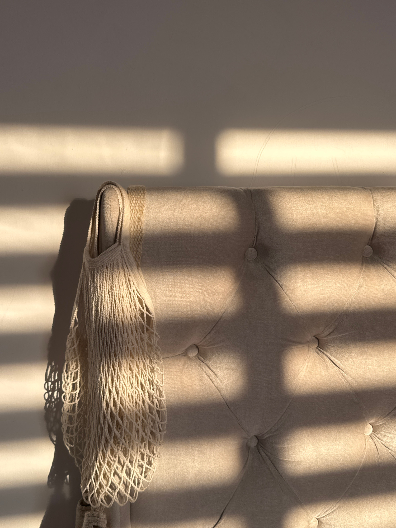 The image presents a close-up view of a tufted, beige headboard with a cream-colored mesh bag draped over the lower edge. Light streams in from a window, casting distinct, parallel shadows across the…read more