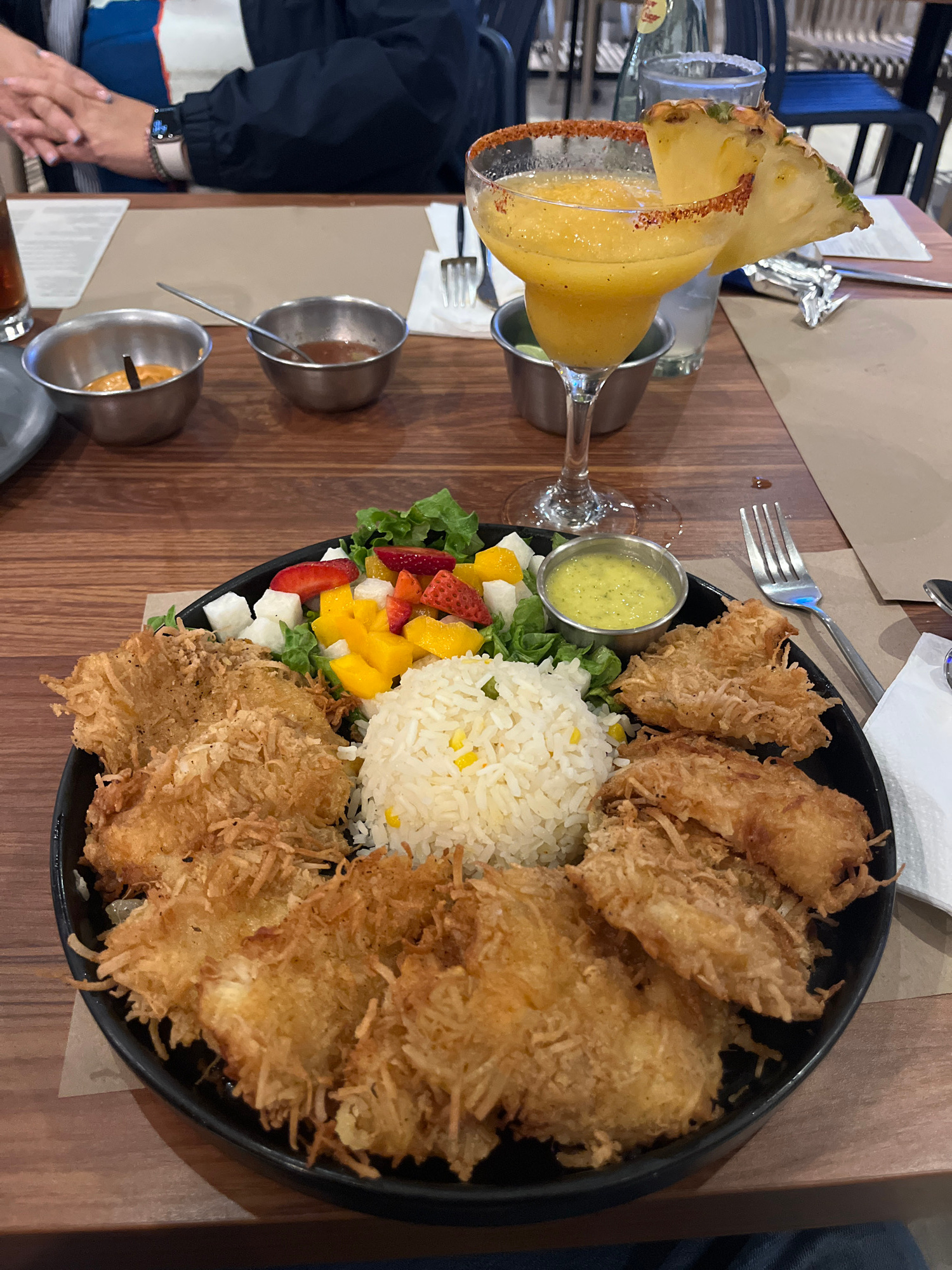 The image shows a table setting with a plate of food and a drink. The plate contains a portion of rice, a salad with mango, strawberries and white cheese cubes, fried coconut-crusted fish and a side o…read more