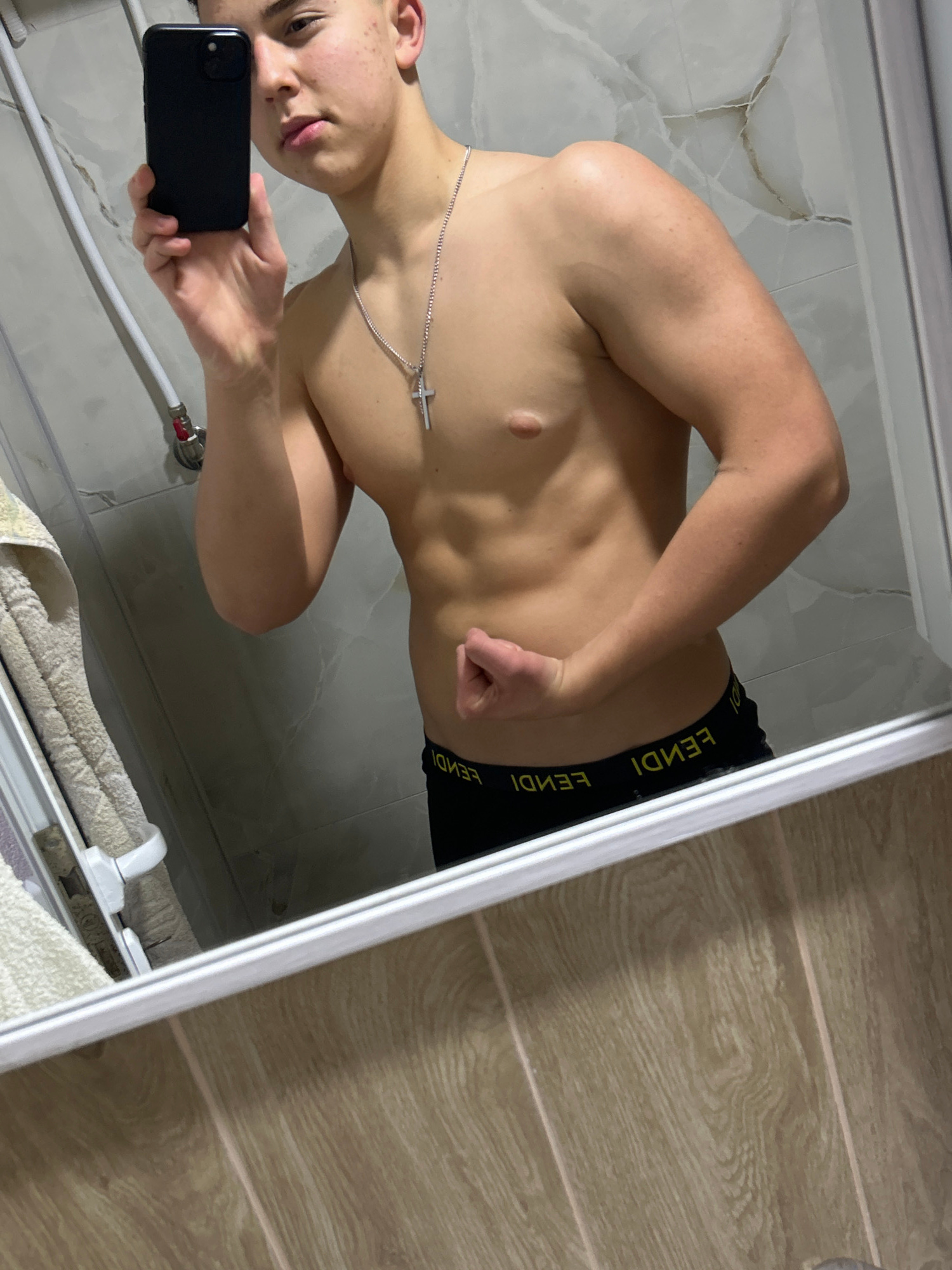 A topless male is taking a mirror selfie indoors. The subject wears black underwear with a yellow Fendi logo waistband and a silver necklace with a cross pendant. He is holding a black smartphone in h…read more