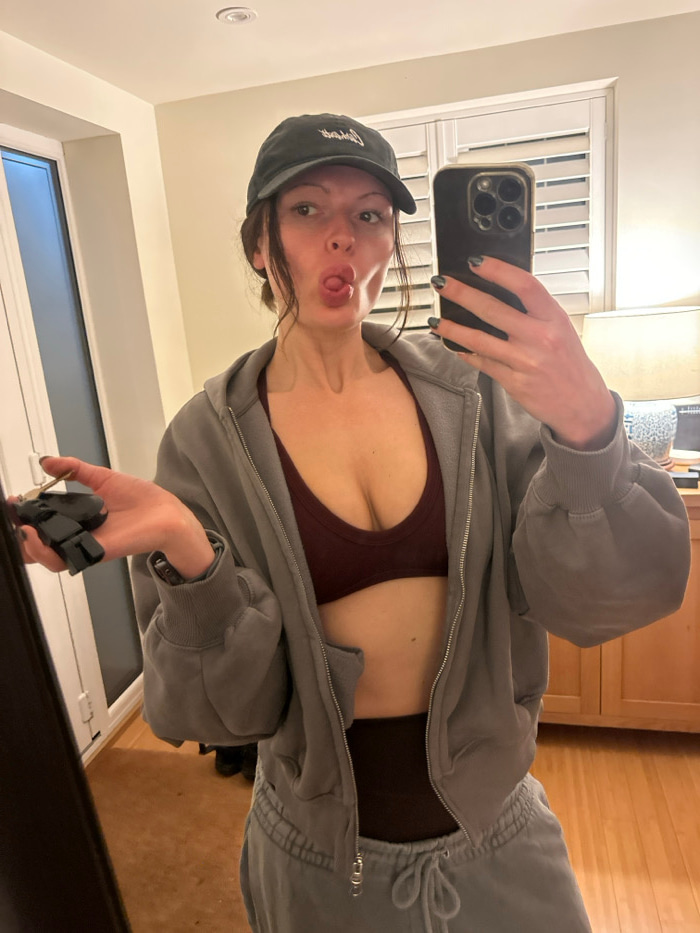 A woman poses in a mirror selfie, sticking her tongue out. She wears a dark baseball cap, a burgundy athletic top, and a gray zip-up hoodie with matching sweatpants. The background includes a window with white blinds, light-colored walls, and a wooden cabinet. She holds a phone with a black case in one hand and keys attached to a carabiner in the other. The image is slightly tilted. | Open Wire