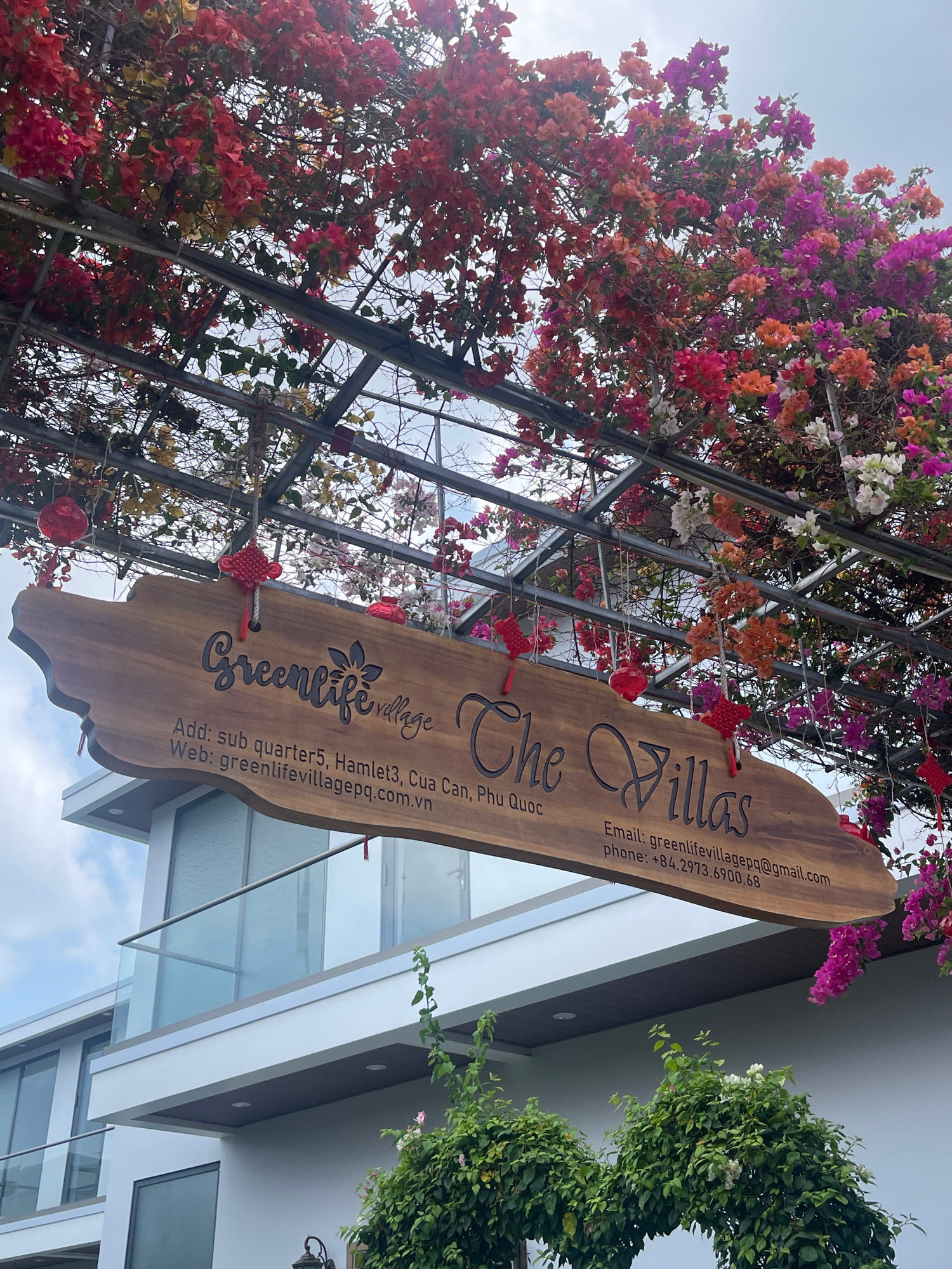 The image depicts the entrance of Greenlife Village The Villas in Phú Quốc, Vietnam. A wooden sign displaying the establishment's name, address (sub quarter 5, Hamlet 3, Cua Can, Phu Quoc), website (g…read more