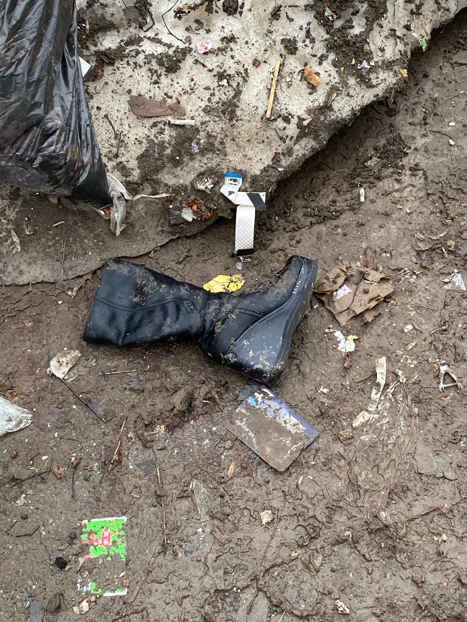 The image depicts a muddy area littered with trash, possibly in Votkinsk, Russia. The ground is covered in mud, small pieces of litter, and debris. A black boot lies horizontally in the center of the…read more