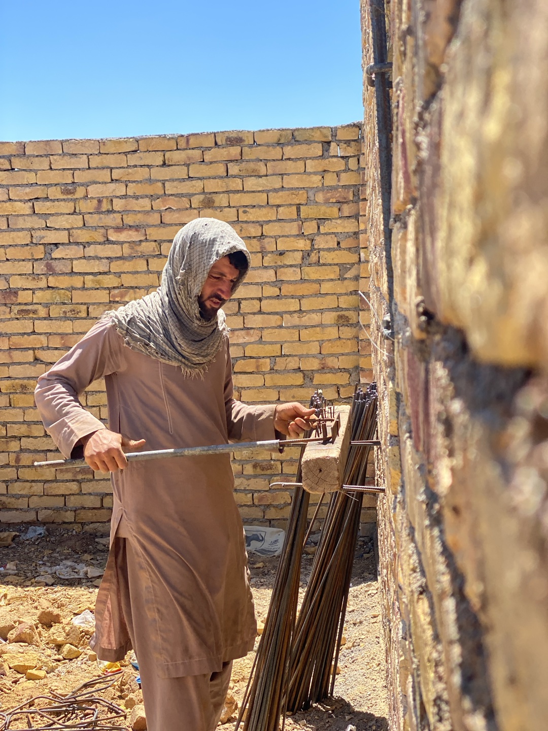 In Kandahar, Afghanistan, a man stands next to a brick wall and metal rods. He is wearing a long brown shirt and pants with a light-colored scarf wrapped around his head. He is holding a metal bar wit…read more
