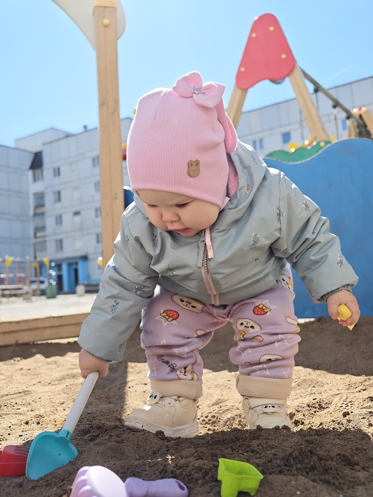 A baby in a pink hat and gray jacket plays in a sandbox. The baby is using a blue and white shovel and other colorful plastic toys. The sandbox is located in a playground in the city of Chaikovsky, Ru…read more