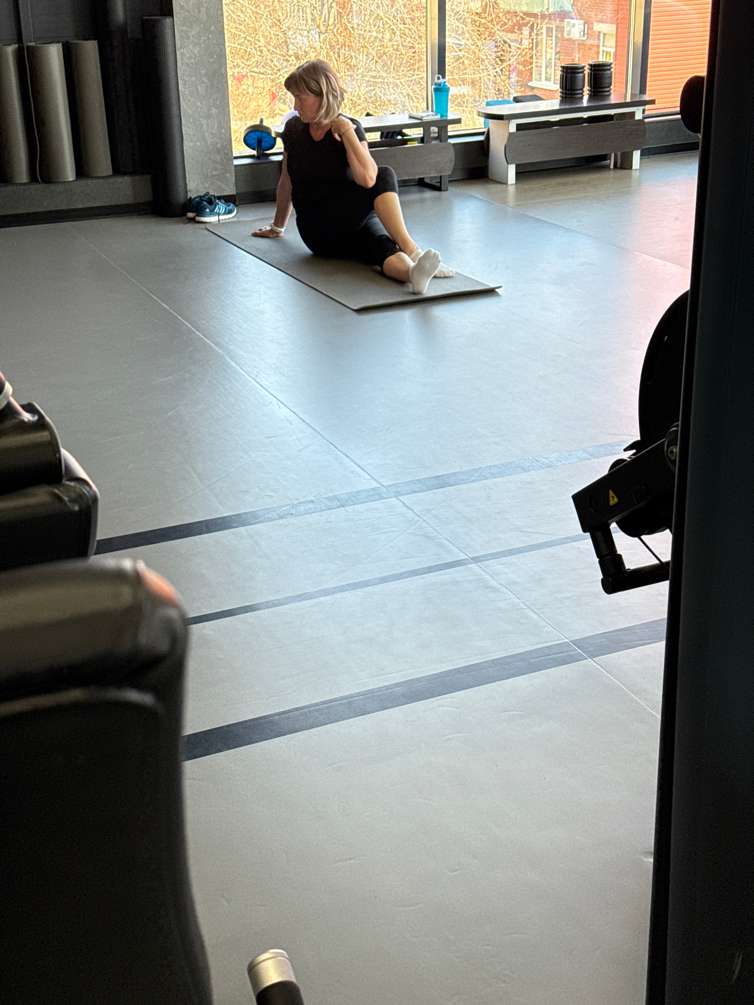 The image displays a woman engaged in exercise within a fitness studio or gym setting. The woman, with blonde hair, is dressed in a black short-sleeved top and black leggings, complemented by white so…read more