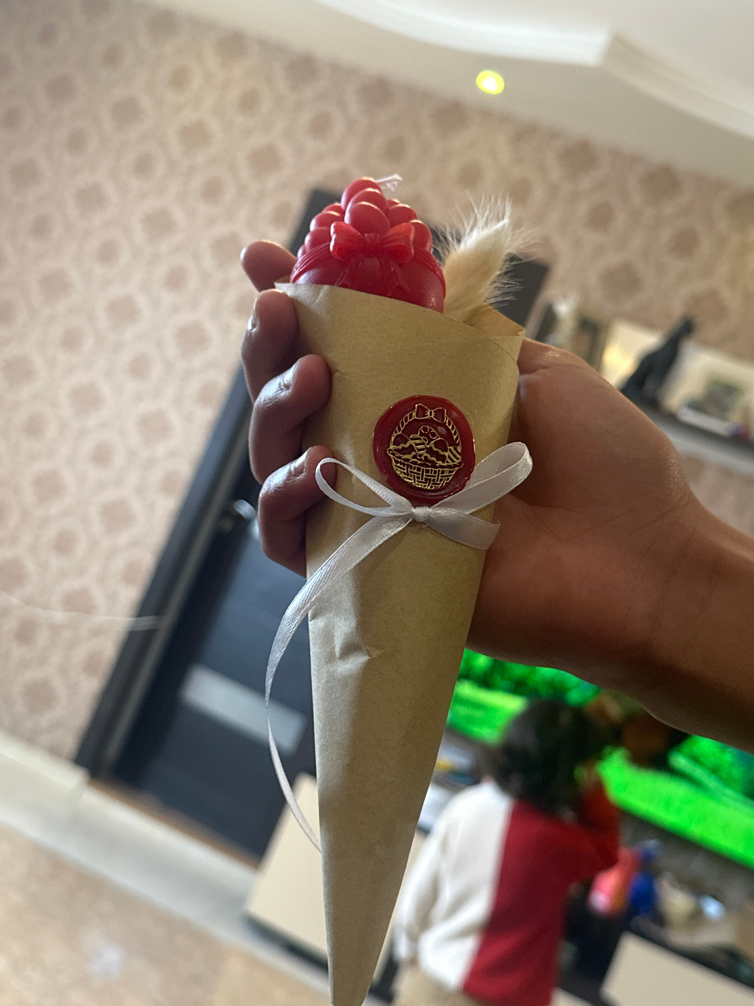 A hand holds a small bouquet of red flowers wrapped in brown paper tied with a white ribbon and sealed with a red wax seal. The background shows a room with patterned wallpaper and a partial view of a…read more