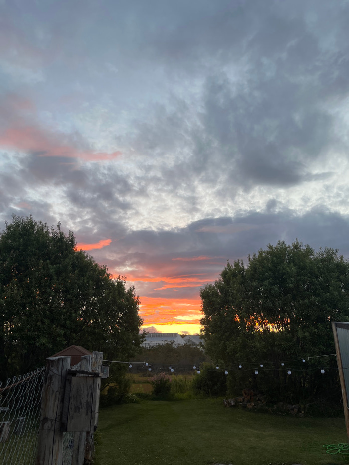 An outdoor scene captures a dramatic sky. Gray and white clouds fill the majority of the frame, with orange and yellow streaks hinting at a sunset or sunrise. The scene is framed by two trees, and a g…read more