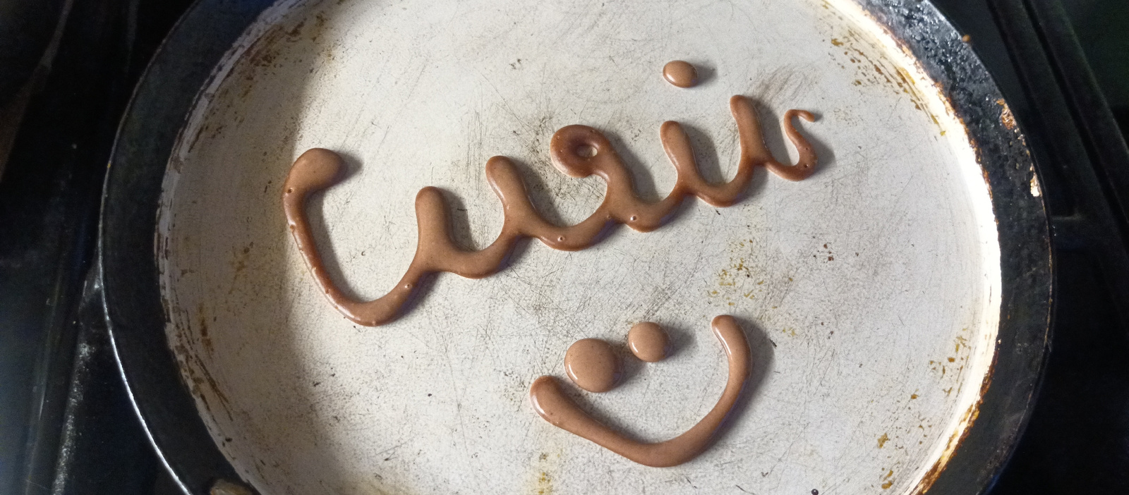 On a worn, off-white frying pan with a black rim, pancake batter has been used to write a word in Arabic script above a smiley face composed of two circular dots for eyes and a curved line for a mouth…read more