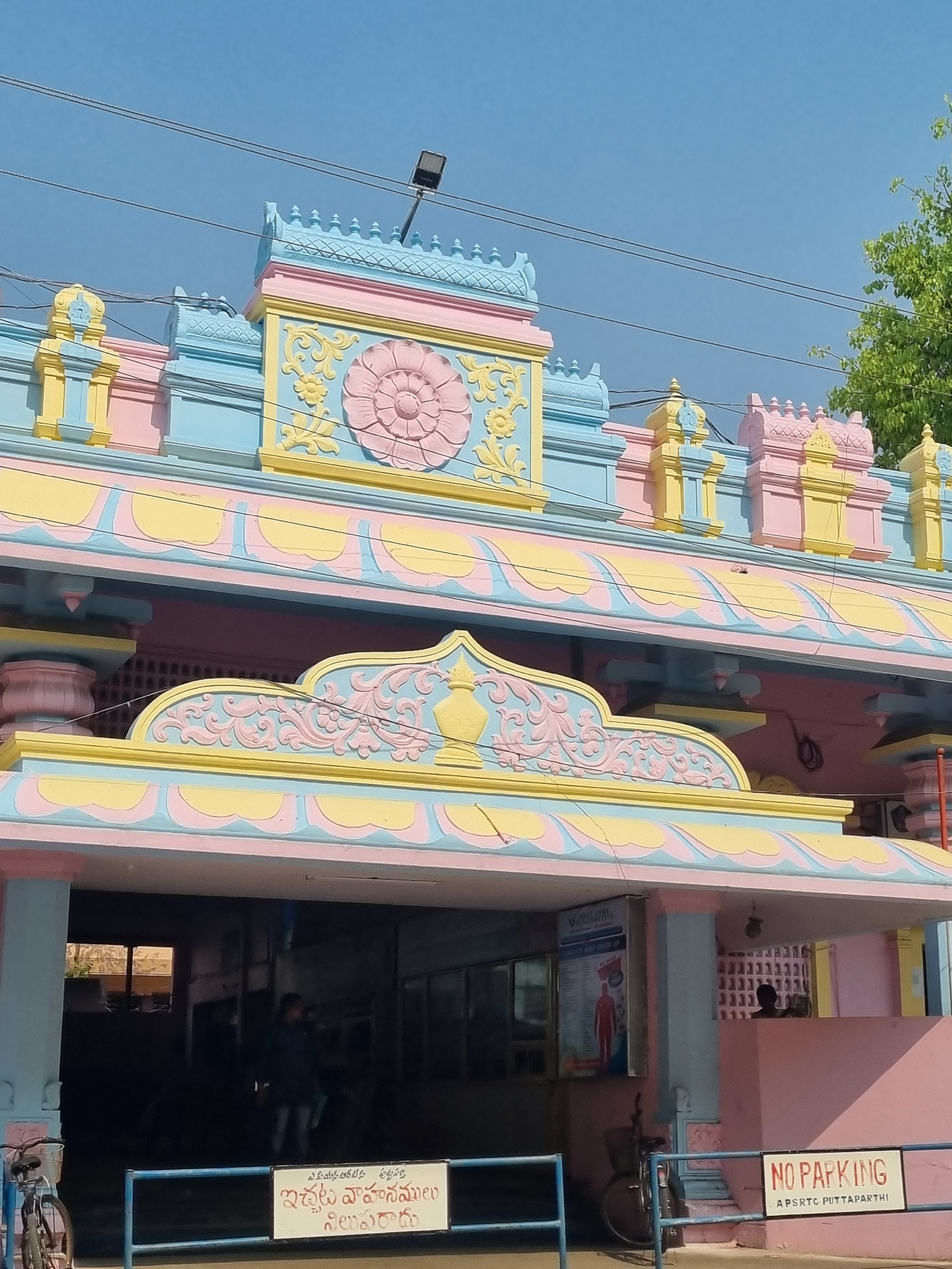 An outdoor, eye-level photograph captures the pastel-colored facade of a building located at the APRTC (Andhra Pradesh Road Transport Corporation) in Puttaparthi, India. The structure prominently feat…read more