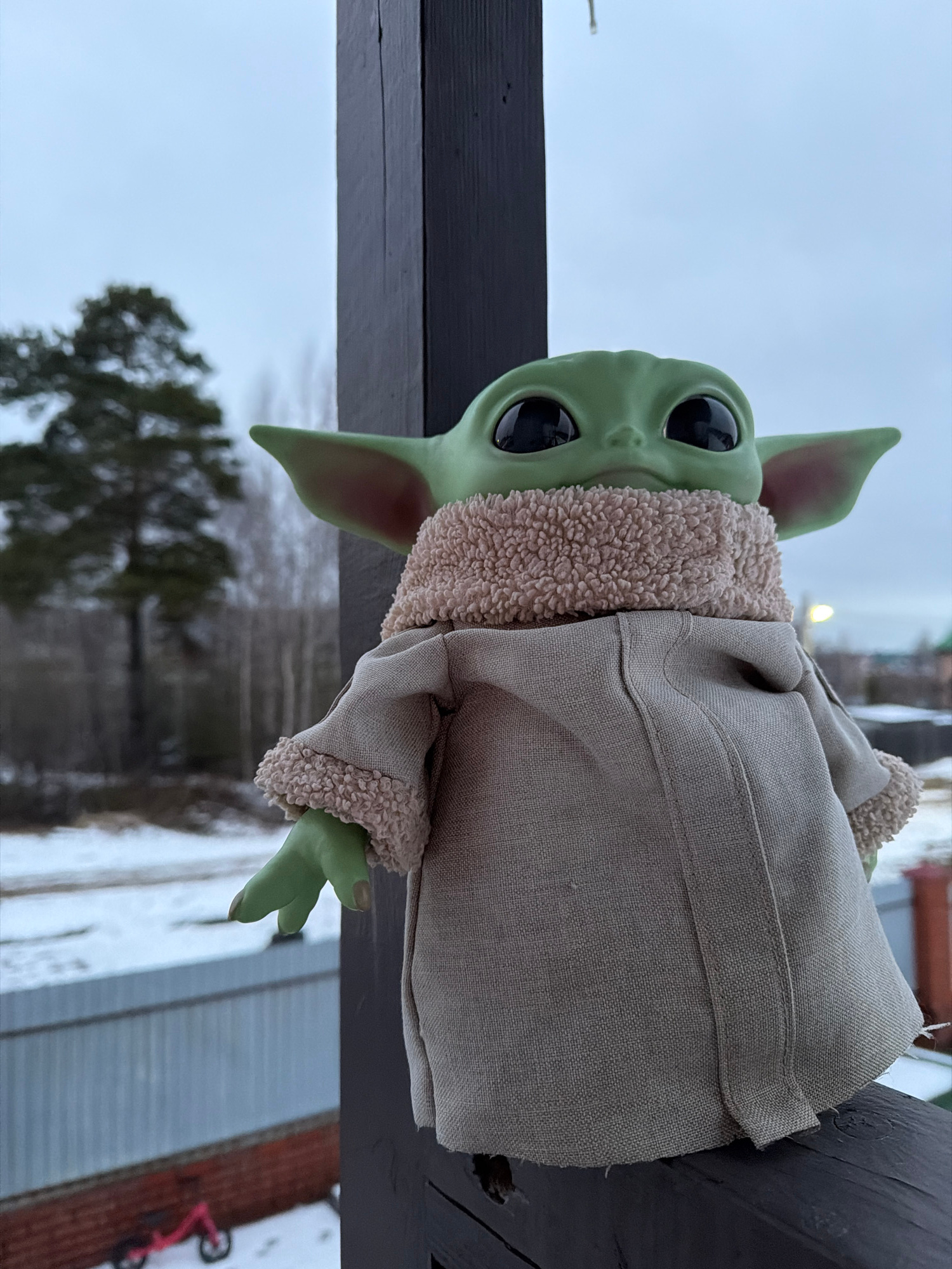 A plush toy resembling "The Child" (Grogu) from the Star Wars series, is placed on a dark-colored, possibly wooden, horizontal beam. The toy is dressed in a tan-colored robe with a fuzzy collar. The b…read more