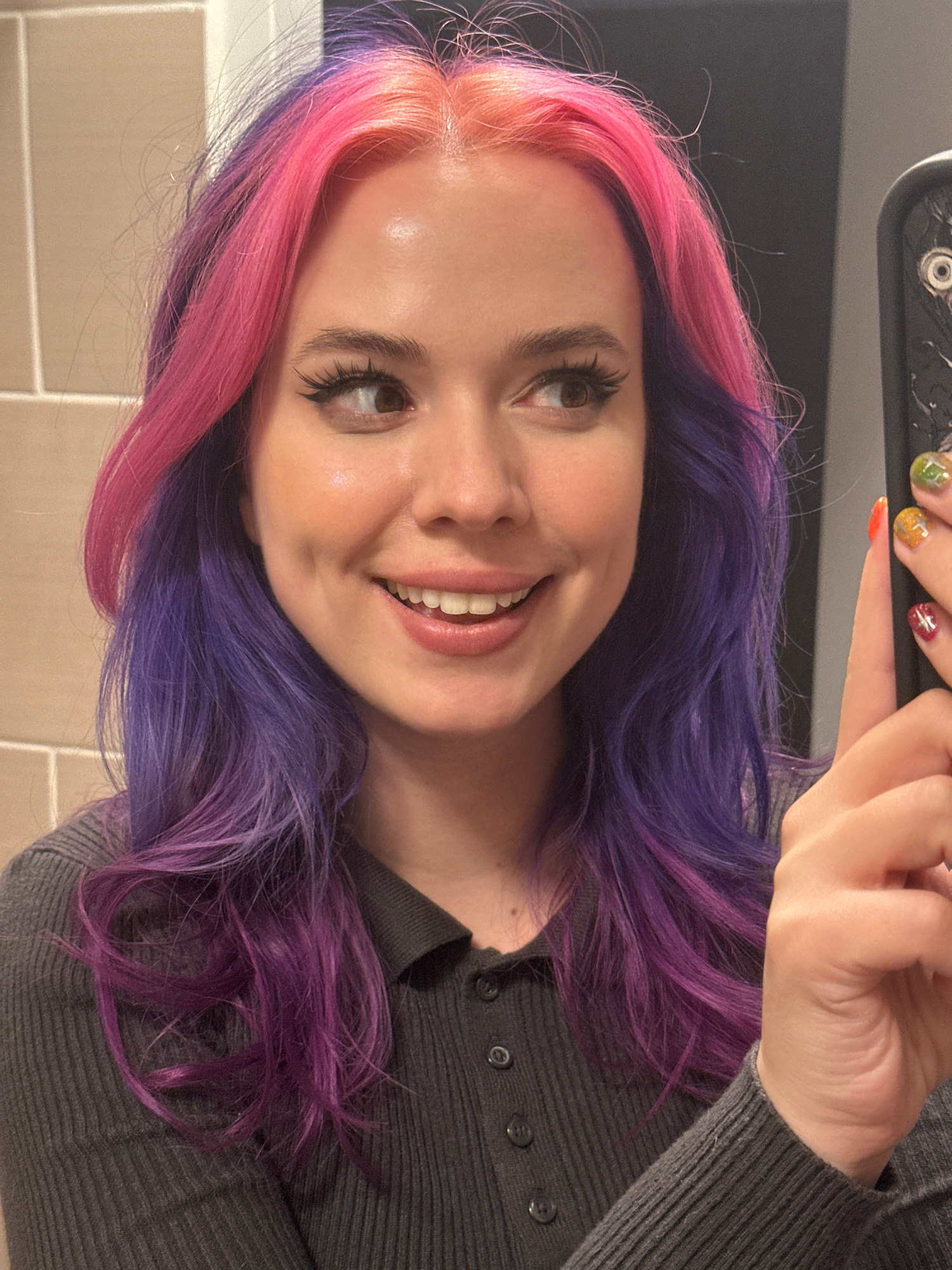 A person with pink and purple hair is facing the camera in an indoor setting, possibly a bathroom with beige tiles visible in the lower left corner. The person is smiling and holding up a phone, sugge…read more