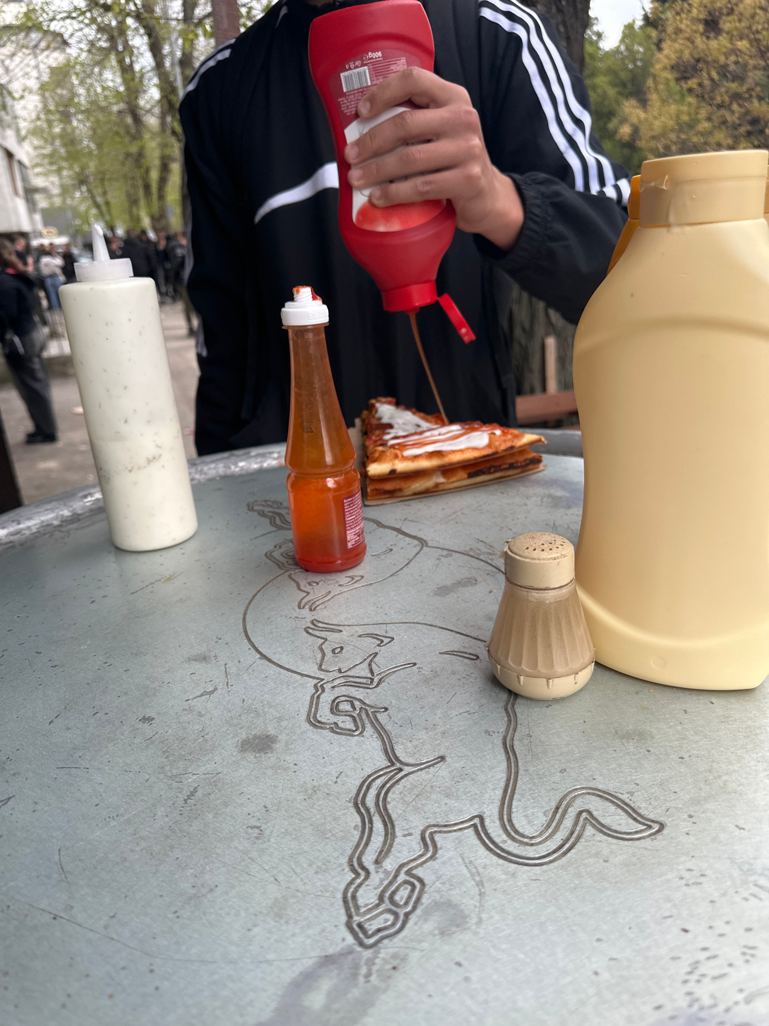 A close-up, slightly tilted view captures a person's hand squeezing ketchup onto a piece of food on an outdoor table, likely in Varna, Bulgaria. The central activity shows red ketchup being dispensed…read more