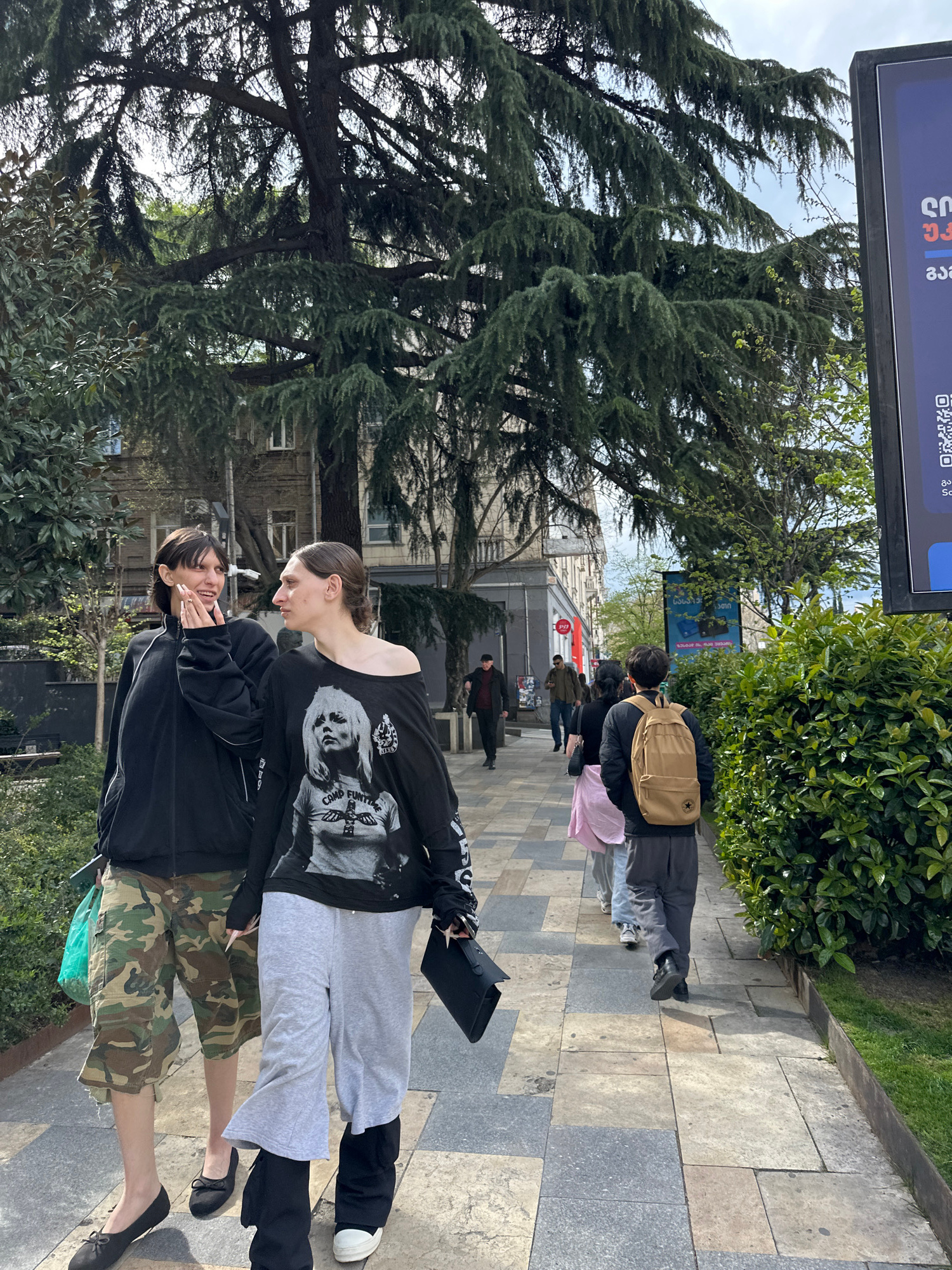 A daytime street scene in Tbilisi, Georgia. A tree dominates the left side of the image. The right side shows a sidewalk with pedestrians walking in both directions. In the foreground, two individuals…read more