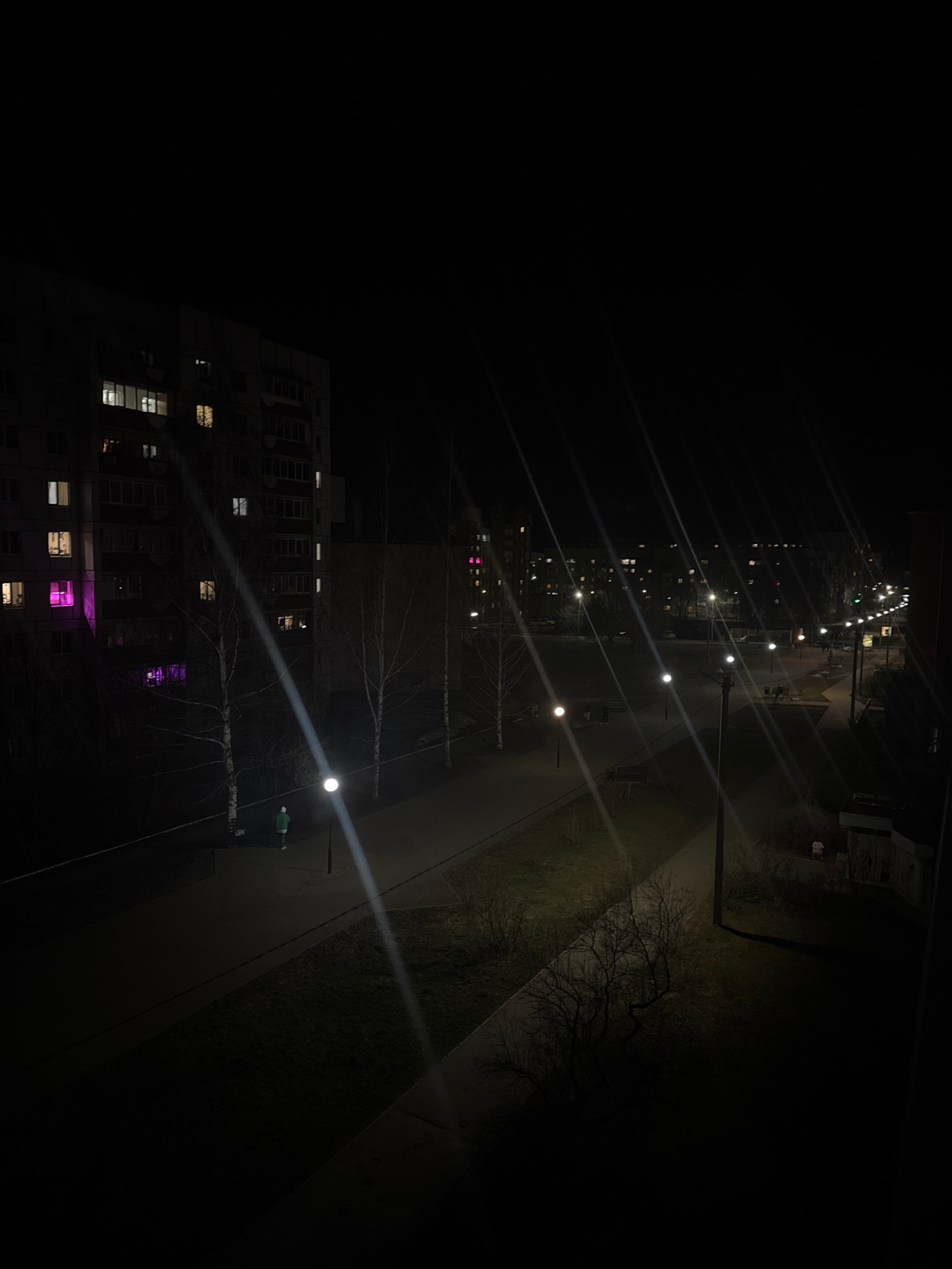 This nighttime, overhead shot depicts a dimly lit urban environment in Chaikovsky, Russia. A row of streetlights illuminates a path and grassy area. A tall apartment building is visible to the left.…read more