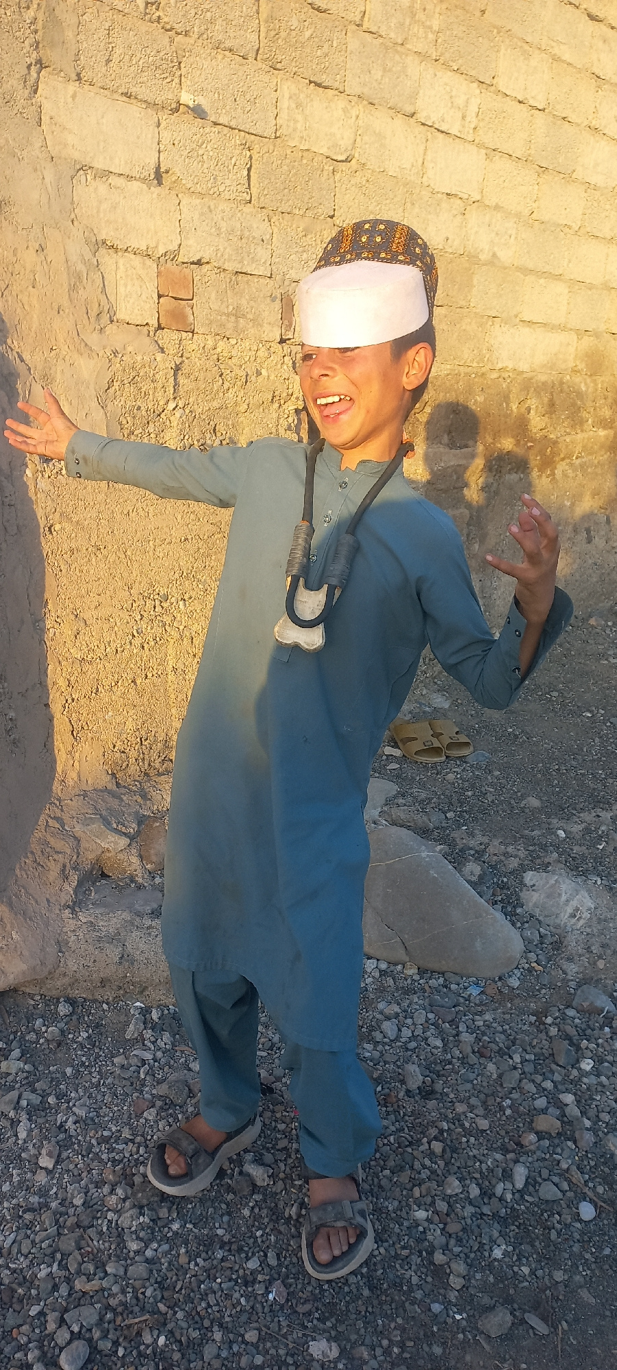A young person, likely male, stands outdoors in Unknown, Unknown, on a surface that transitions from brick to gravel and small stones. The individual is dressed in a blue outfit and wears sandals. The…read more