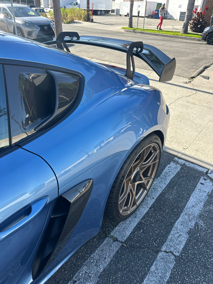 A light blue sports car is parked on a street with a shadow. The car features a prominent rear wing and bronze-colored wheels. A carbon fiber air intake is visible on the rear quarter panel. A pedestr…read more
