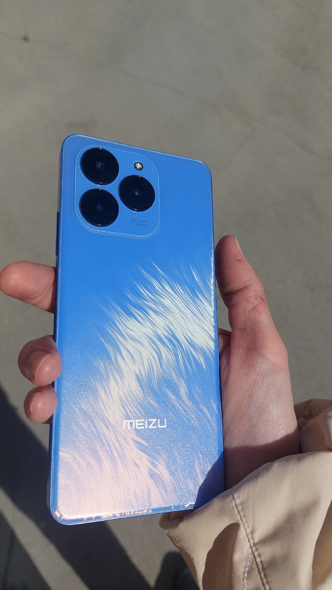 A person is holding a blue Meizu smartphone in their right hand, likely outdoors on a sunny day. The phone has three visible camera lenses arranged in a triangular formation near one end. The brand na…read more
