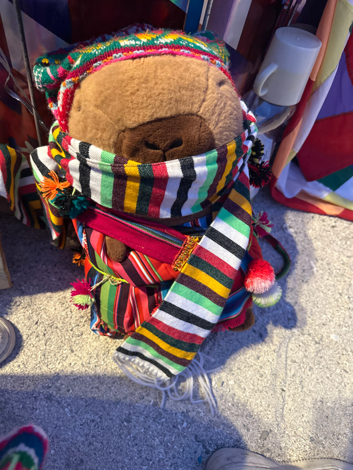 A stuffed bear toy is partially covered in brightly colored, striped fabric. The bear's head is visible, with a knitted hat in green, red, and other colors. Additional items surround the bear, includi…read more