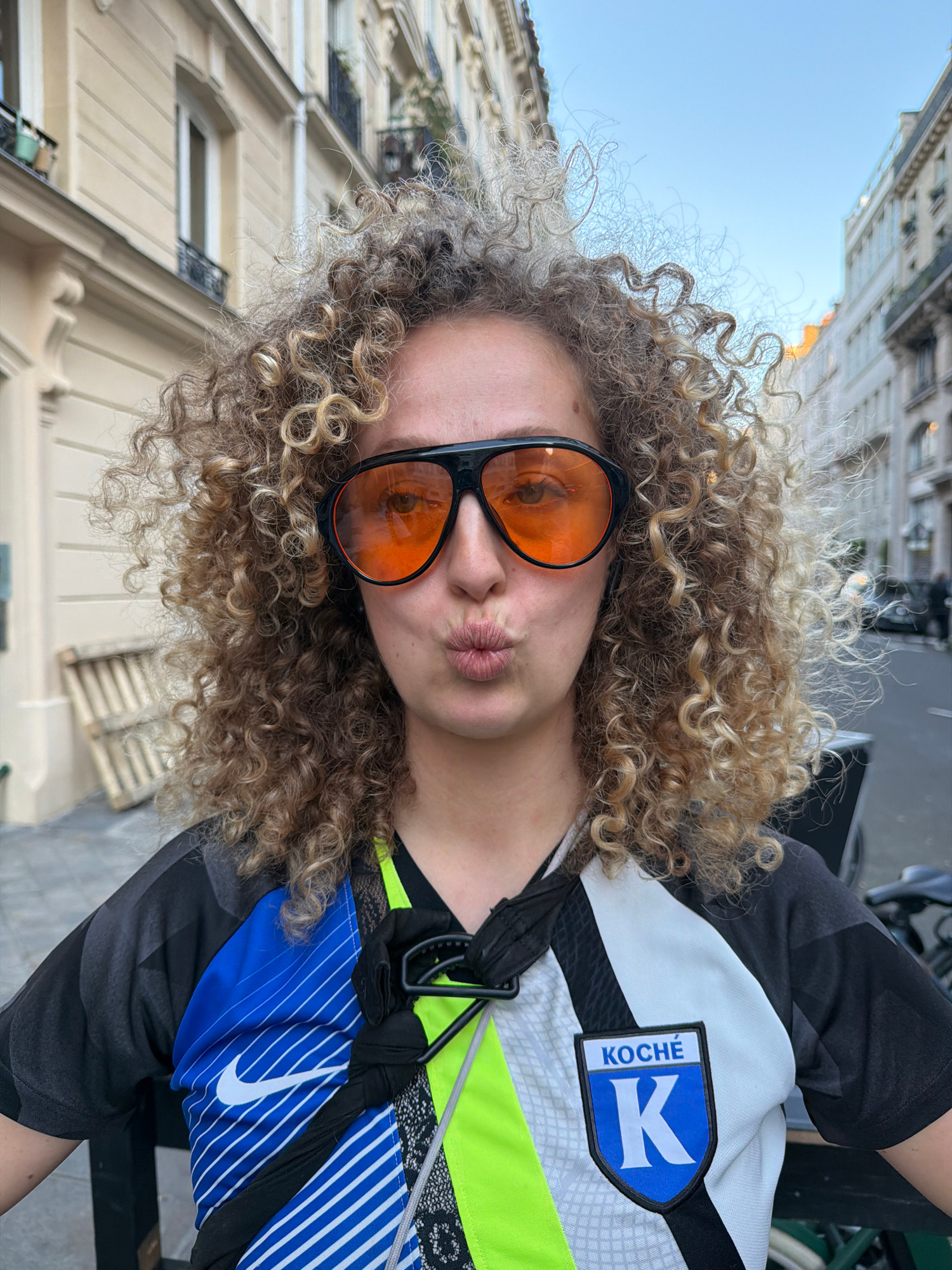 A person with curly hair is depicted from a low angle, possibly taken while lying down. They are wearing dark-rimmed glasses with orange lenses and have pursed lips. The individual is wearing a Nike-b…read more
