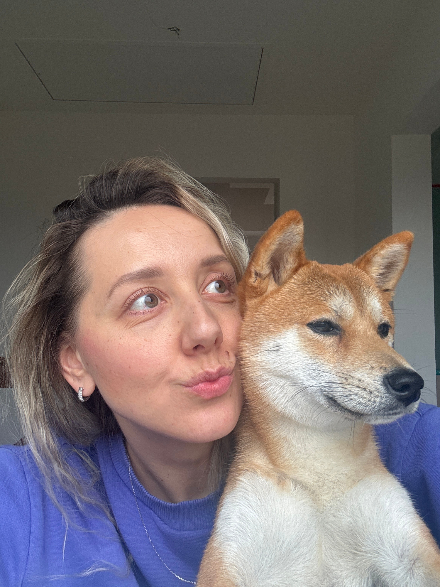 A Shiba Inu dog rests on a woman's face and shoulder. The woman is wearing a purple top, and her expression is a slight pout. The background appears to be a room with light walls. There is no evidence…read more