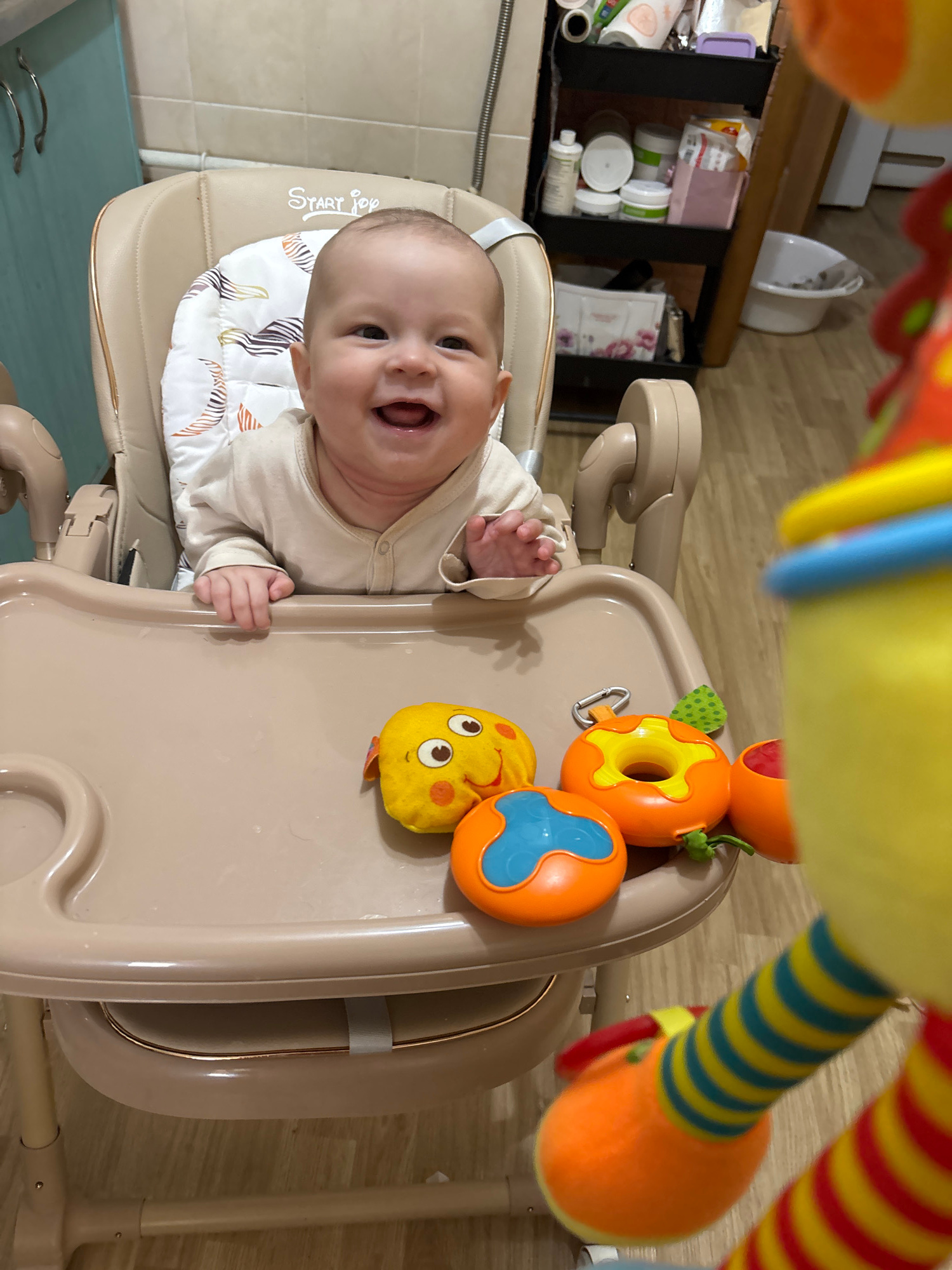 A smiling baby sits in a highchair with colorful toys attached to the tray. The highchair is located in a room with a shelf filled with various containers and household items in the background. The ro…read more