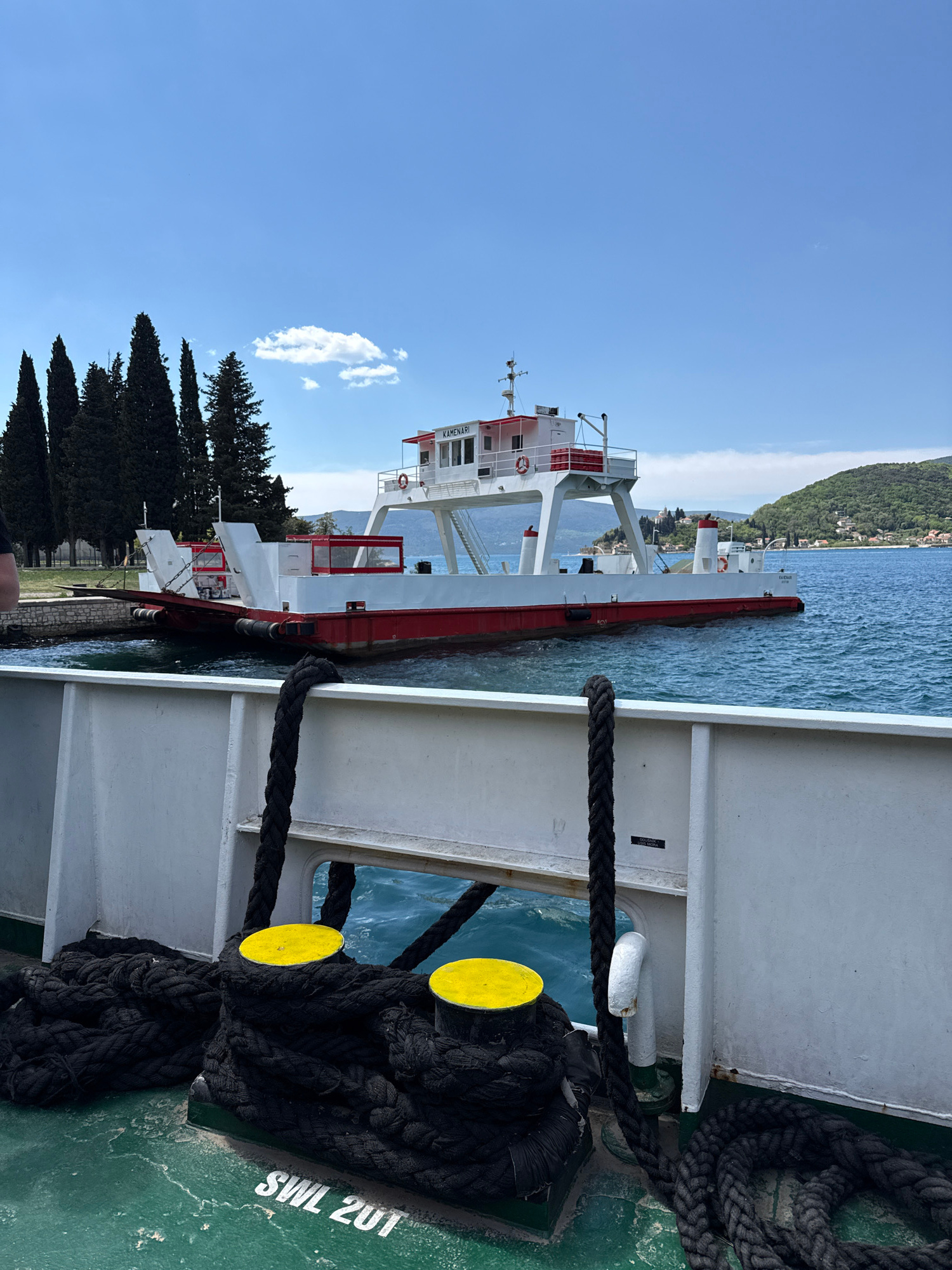 The image captures a partial view of a ferry named "Kamenari" docked in Lepetane, Montenegro. The ferry's red and white exterior is visible against a backdrop of blue sky and water, with a distant, gr…read more