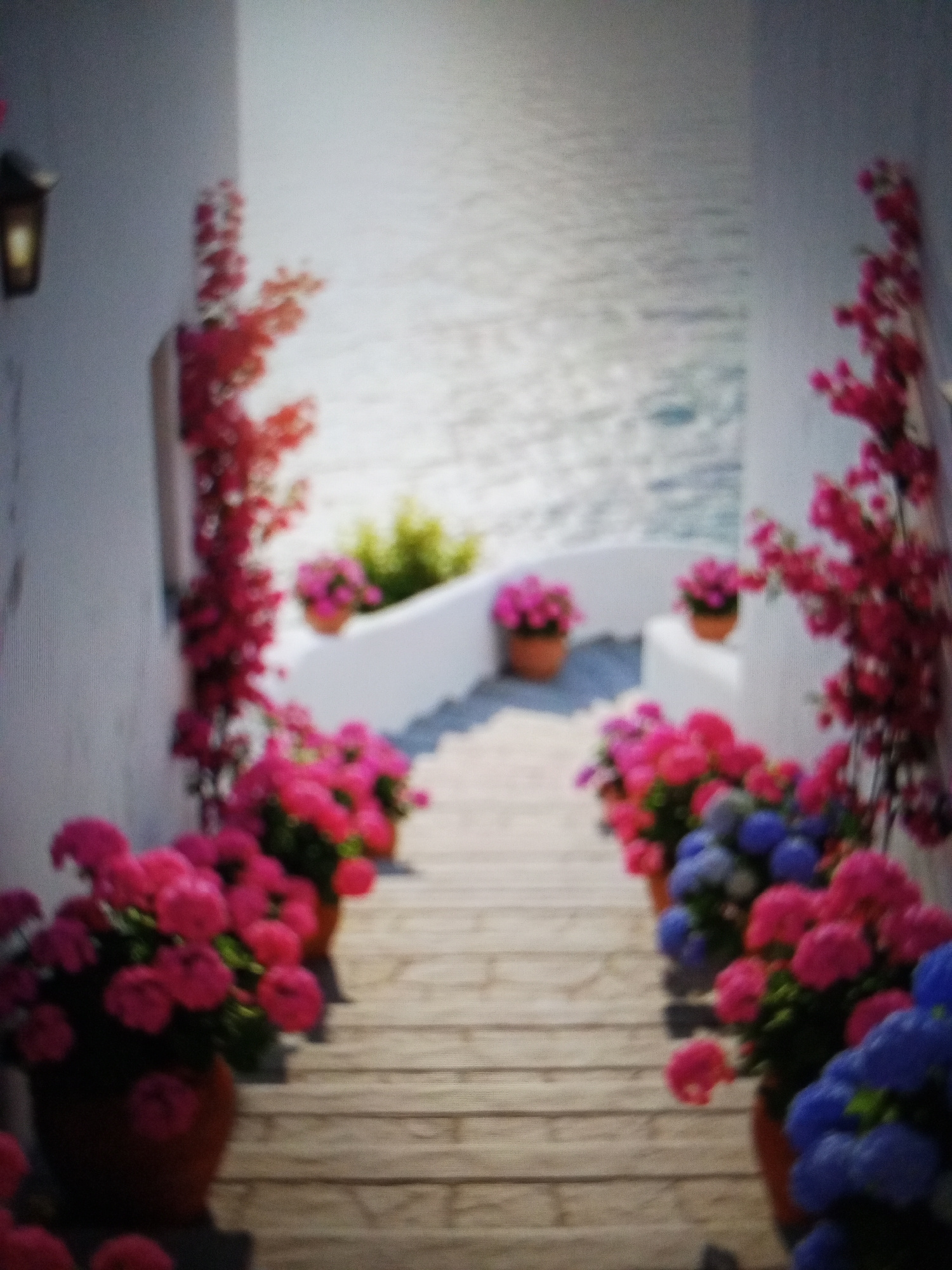 A blurred, eye-level photograph depicts a downward-sloping set of stairs or walkway leading to a body of water. The stairs are light in color, possibly stone or painted wood, with horizontal planks. T…read more