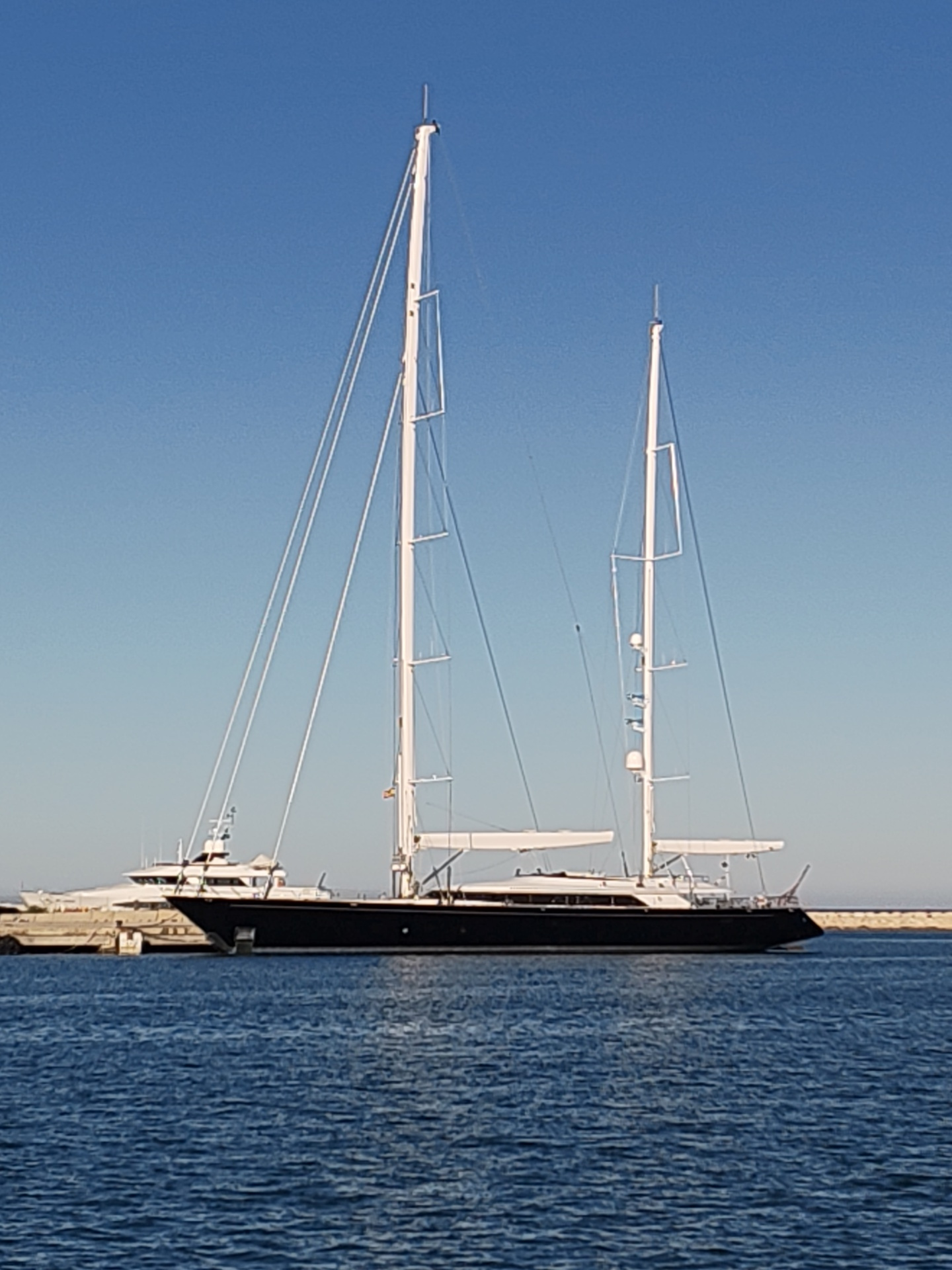 The image depicts a large, two-masted sailing yacht moored in the harbor of Dénia, Spain. The yacht has a dark hull and tall white masts with rigging. It is positioned near a breakwater, visible in th…read more