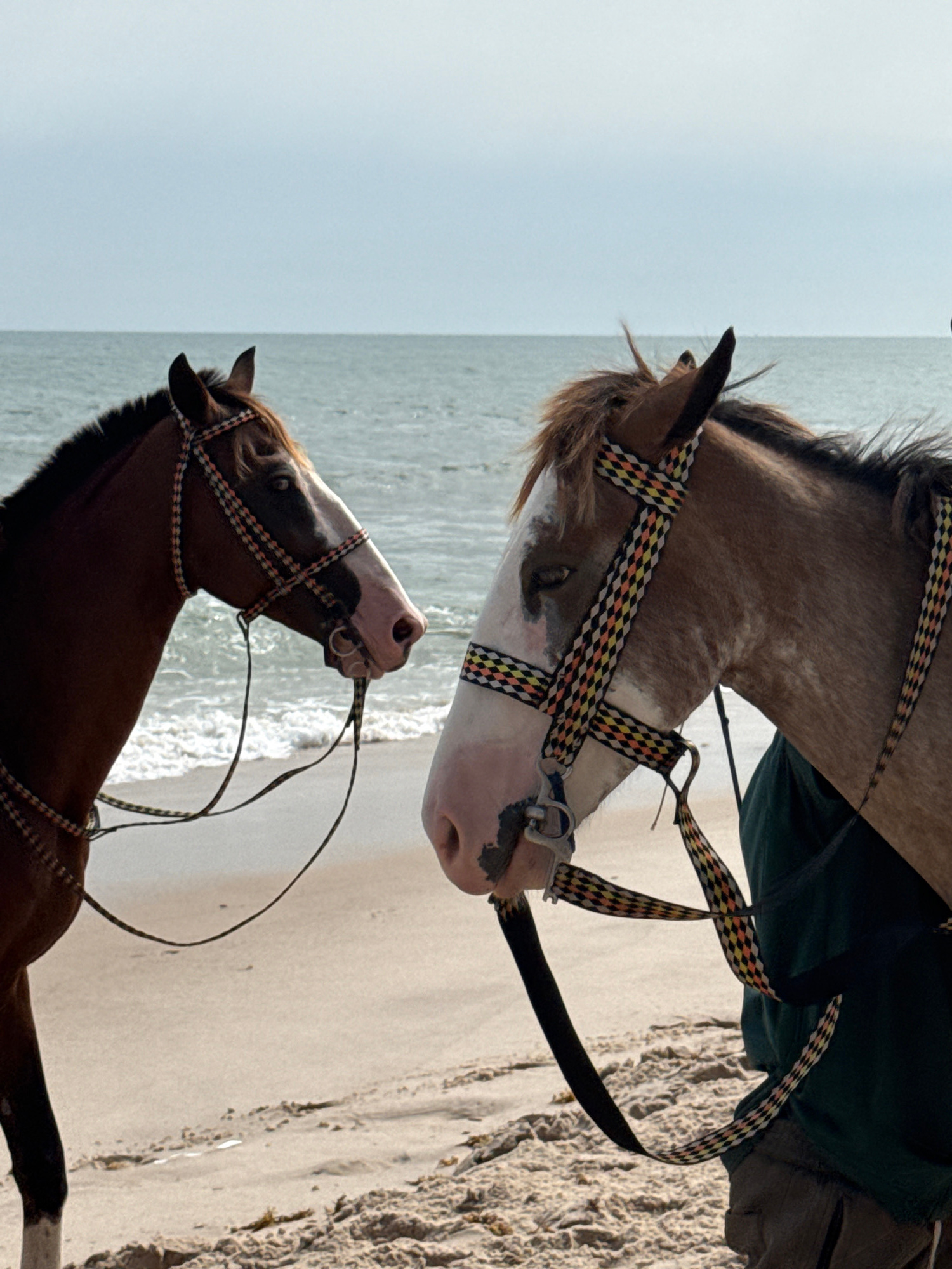 The image shows two horses standing on a sandy beach near the ocean. The top horse is light brown with a white face and a colorful checkered bridle. Part of its rider is visible, wearing a dark green…read more