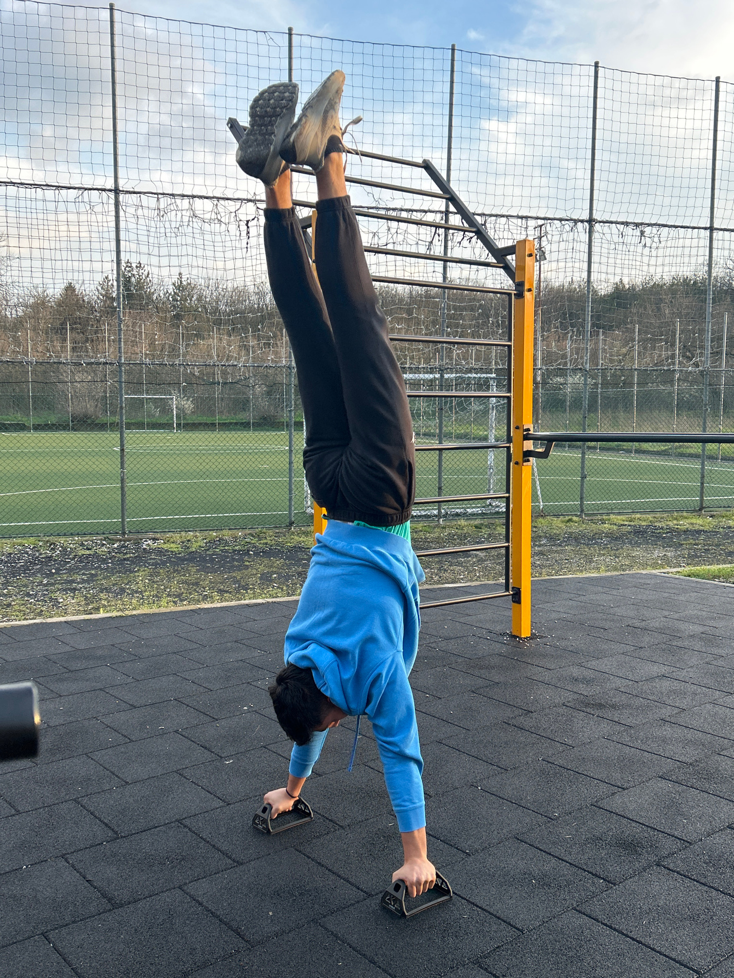 A person is performing a straight body hold on an outdoor calisthenics structure. The person is wearing a blue hooded sweatshirt, black pants, and grey sneakers. They are gripping a black parallette w…read more