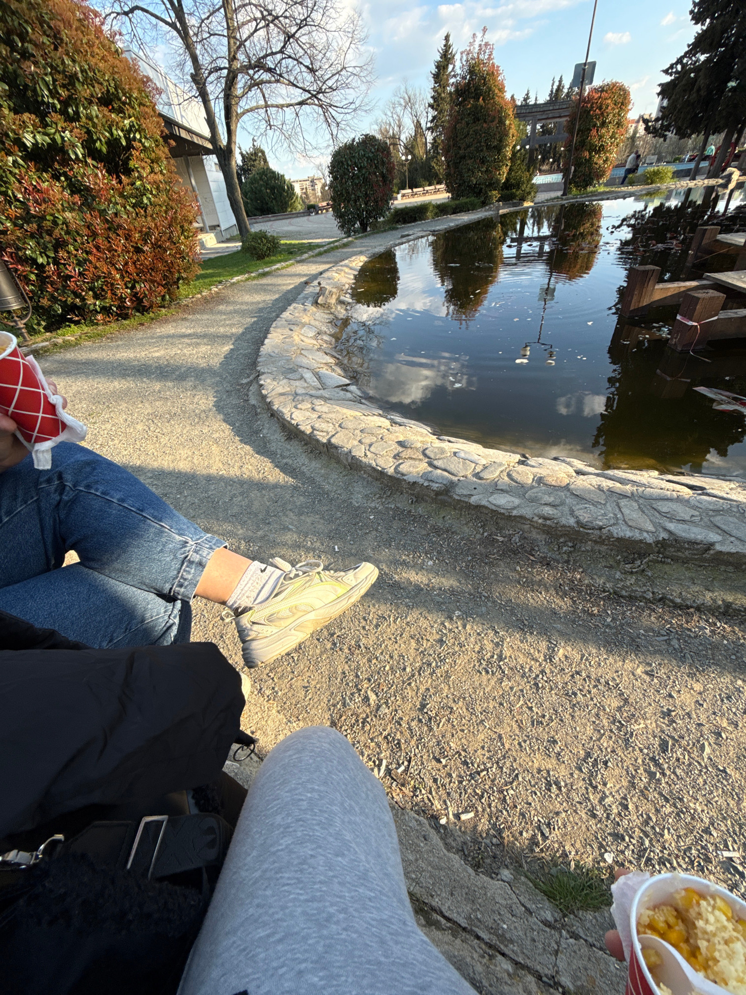 A person is sitting next to a pond at the park "Ayazmoto" in Stara Zagora, Bulgaria, with a container of food in hand. The pond has a stone edge. A walking path is visible next to the pond. The indivi…read more