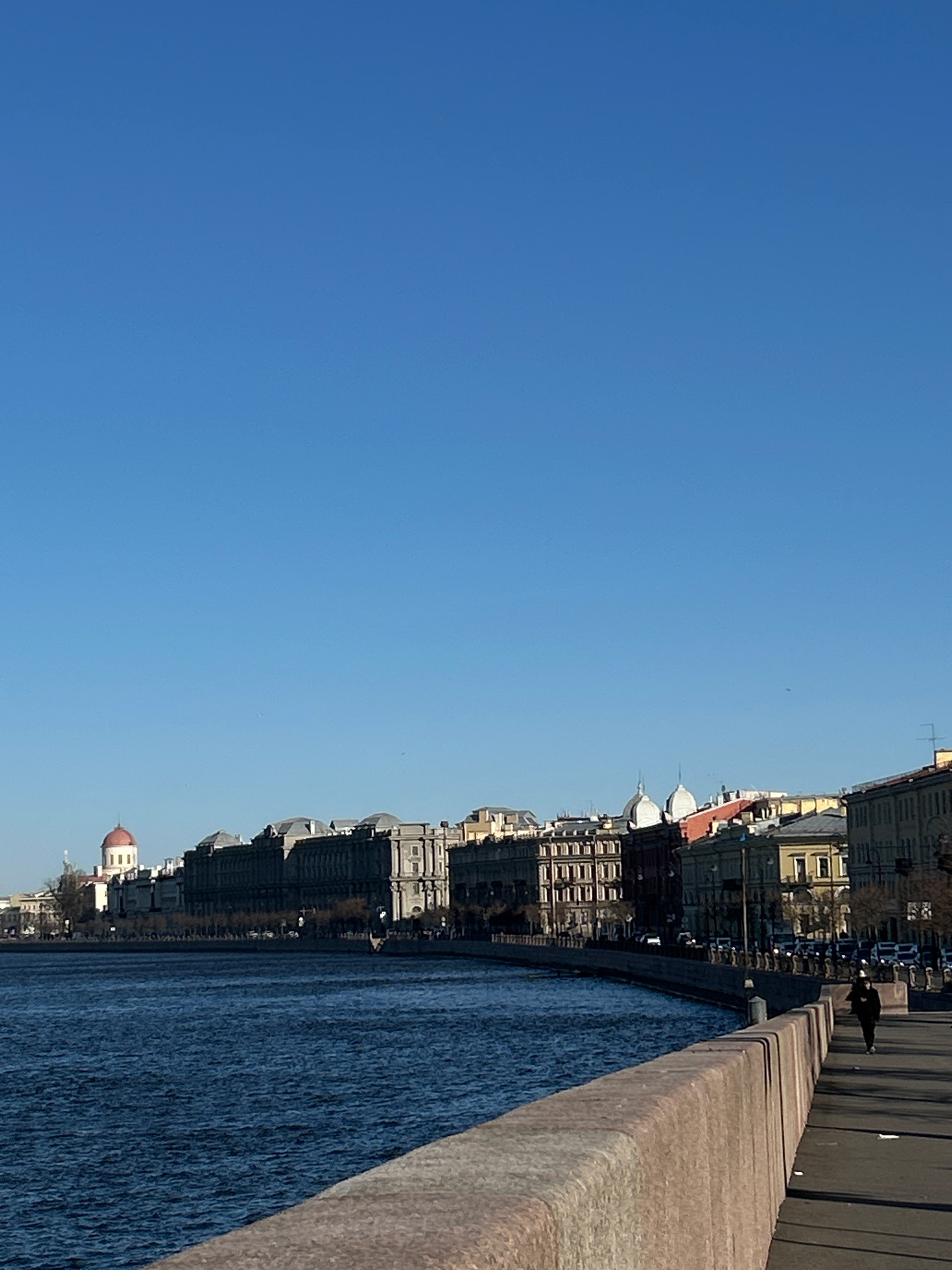 The image captures a wide-angle view of a city embankment and waterway, presenting a serene daytime scene. The dominant feature is a vast, clear blue sky occupying the upper left and central portions of the frame. Below the sky, running diagonally across the right side, is a sturdy stone embankment wall, suggesting a river or canal. The water, a deep blue hue, exhibits subtle ripples on its surface. On the opposite bank, a continuous line of historic-looking buildings stretches horizontally across the image. These structures display varied architectural styles, with notable elements including two light-colored domes topped with spires near the center, and a single reddish dome further to the left. Bare trees are visible along the far bank, interspersed among the buildings. In the distance on the far embankment, a solitary person dressed in dark clothing is walking. Faint outlines of vehicles can also be discerned among the buildings. The scene is set on a bright, sunny day with no clouds, indicating fair weather. The architectural details, particularly the embankment and building styles, are consistent with the provided context of Saint Petersburg, Russia. No visible text is present in the image. | Open Wire