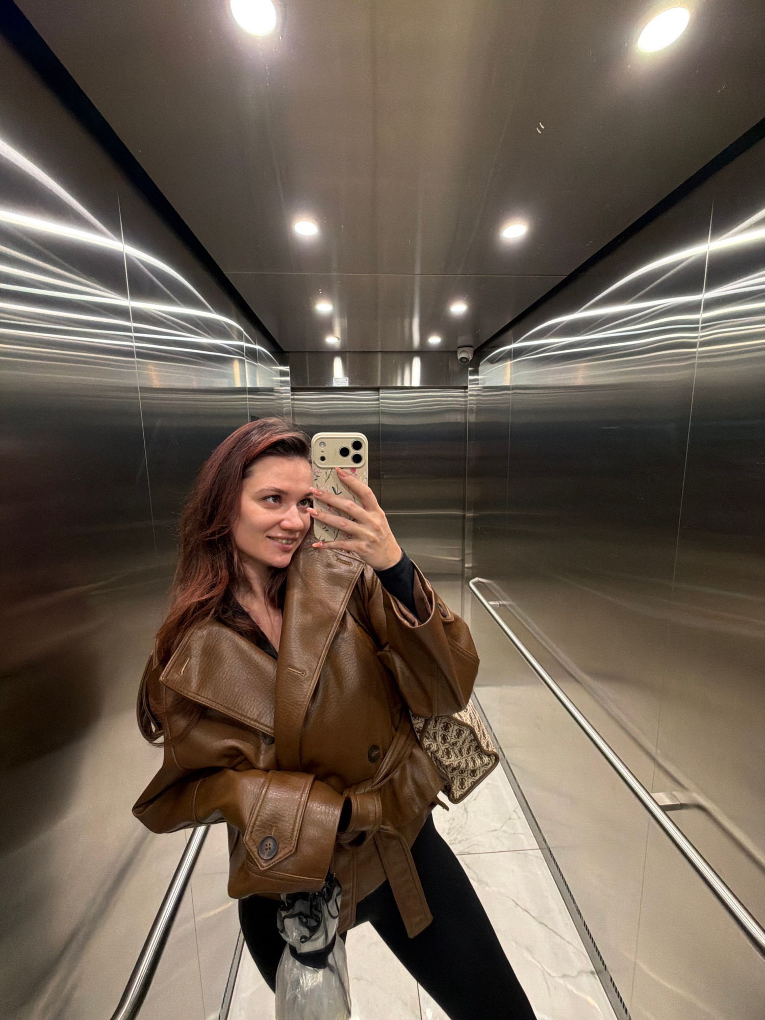 A woman is taking a selfie in an elevator. The walls of the elevator are stainless steel. There are recessed lights in the ceiling and shiny streaks reflecting off the stainless steel. The floor is ti…read more