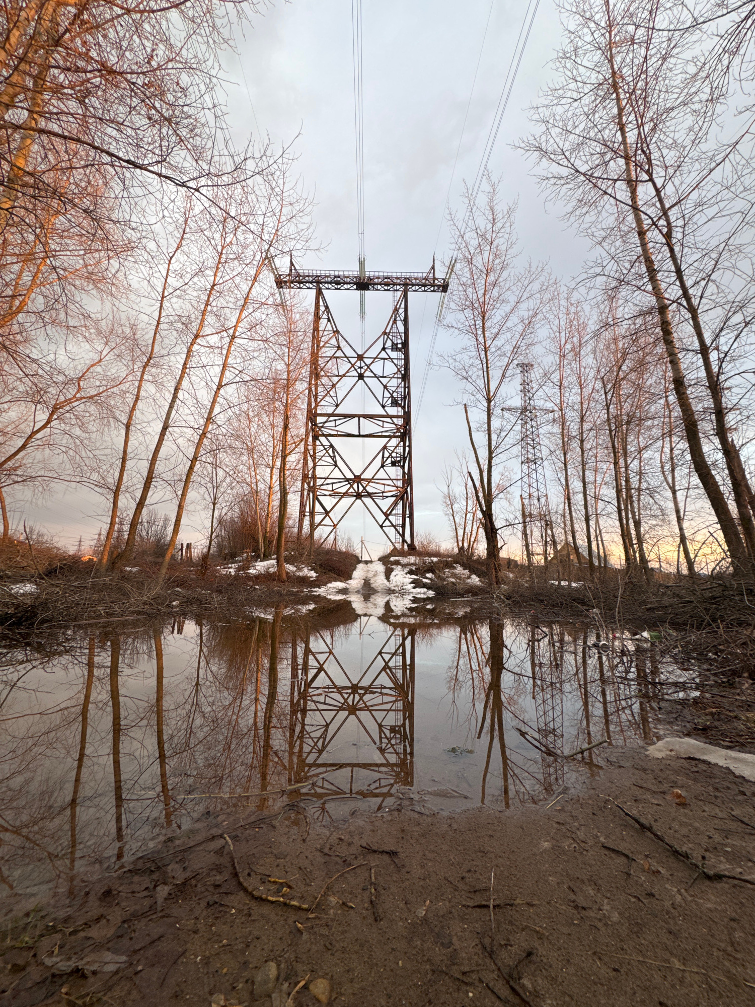 The image is a reflection in a puddle. The reflected image consists of bare trees, an electrical tower, the sky, and the sunset. The puddle reflects the tower and the trees and the sky. The puddle is…read more