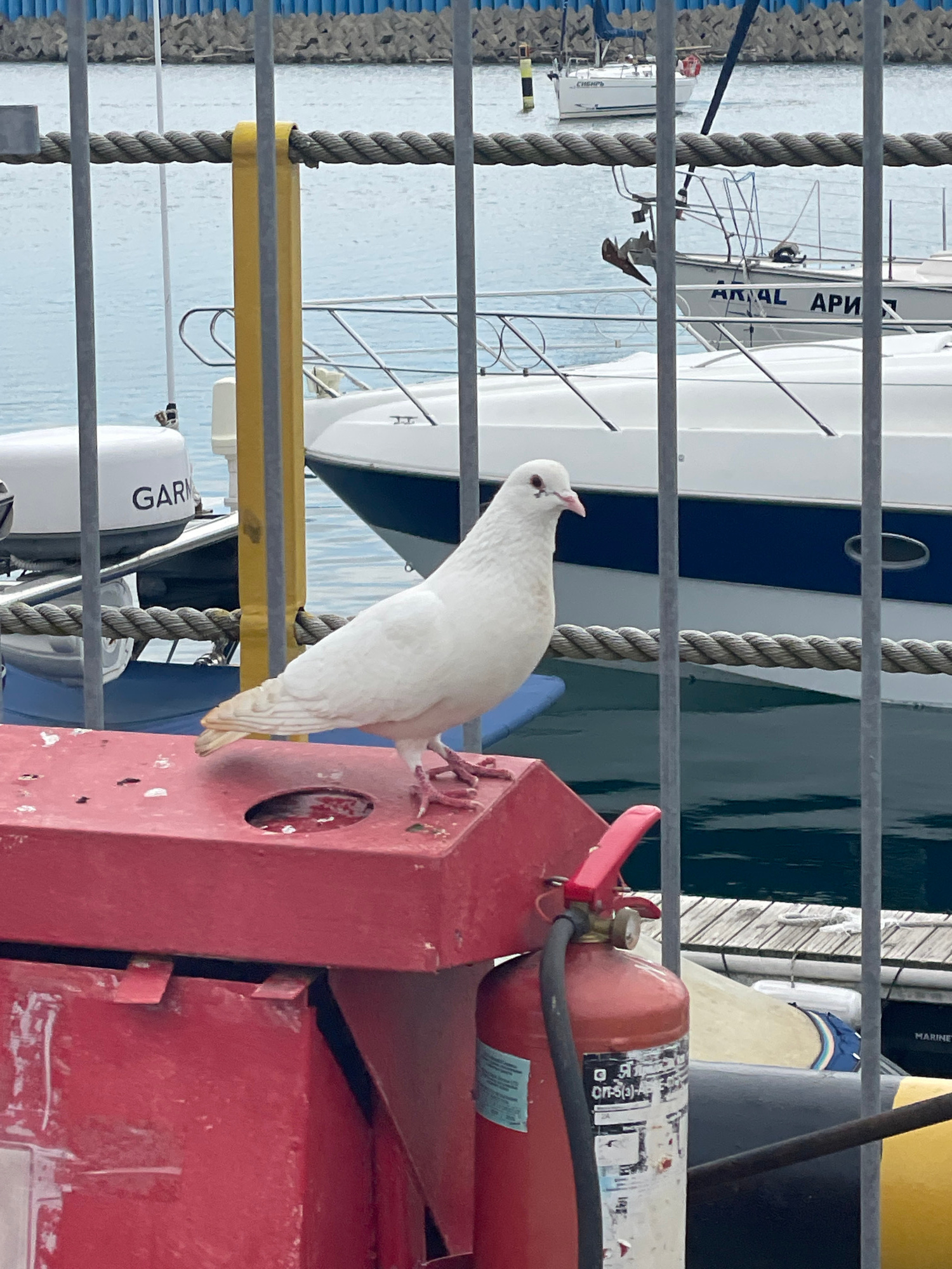 A white pigeon is perched on a red metal structure beside a body of water in Sirius, Russia. A red fire extinguisher is mounted on the metal structure. A boat is visible in the background through a me…read more
