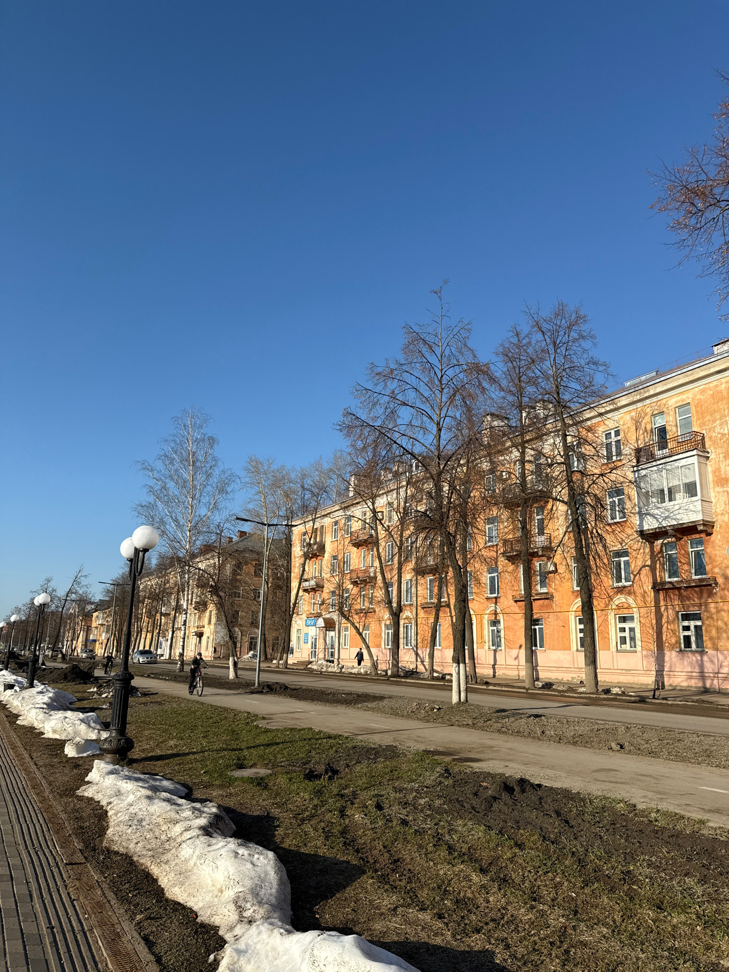The image shows a street scene in Votkinsk, Russia, on a clear day. The sky is a solid blue. On the right side of the frame, a row of orange apartment buildings lines the street. Trees with bare brancβ¦read more