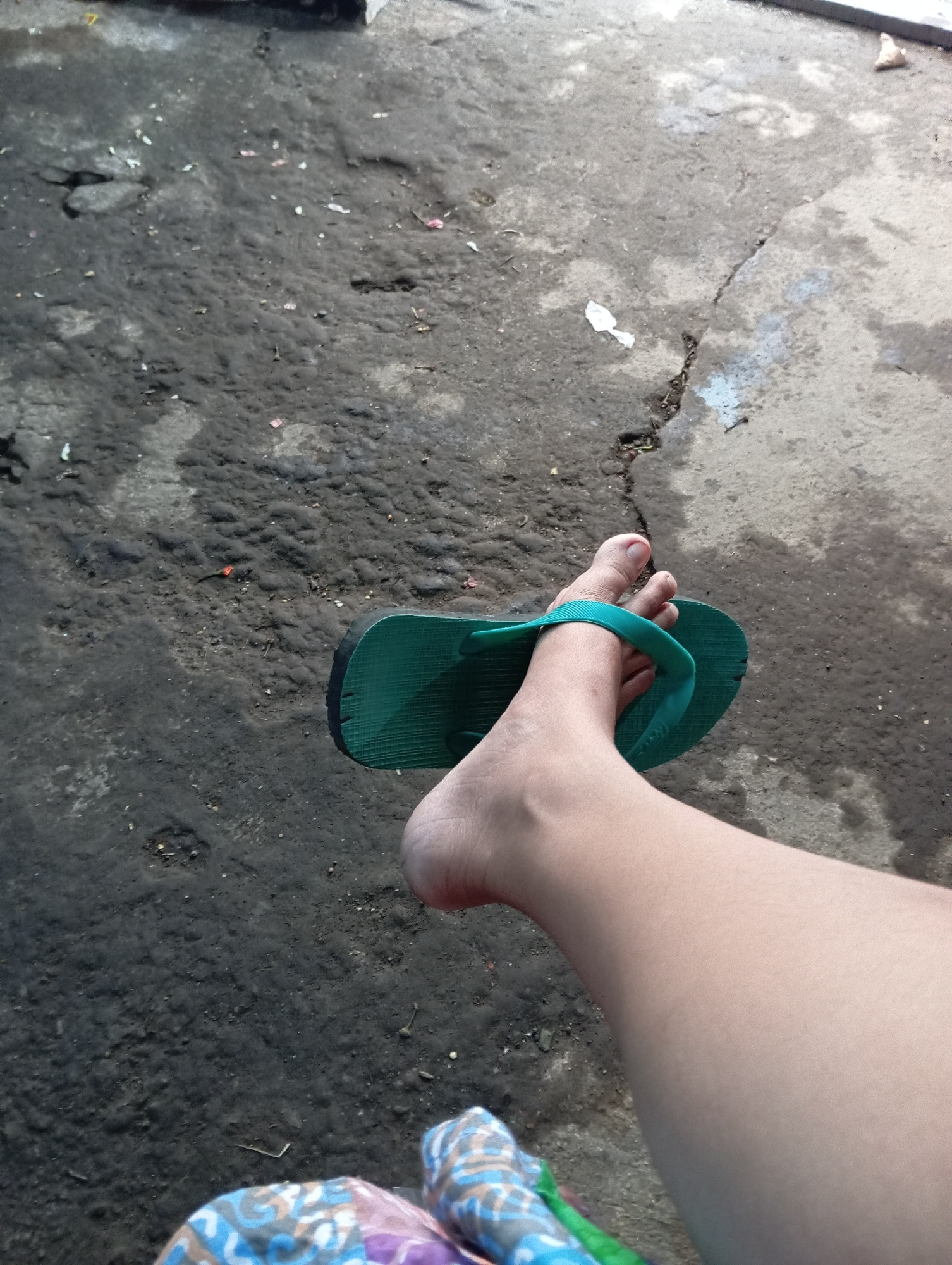 A person's bare foot is partially inserted into a green flip-flop on a cracked and weathered concrete surface in Baron, Indonesia. The individual's leg extends into the upper-right corner of the frame…read more