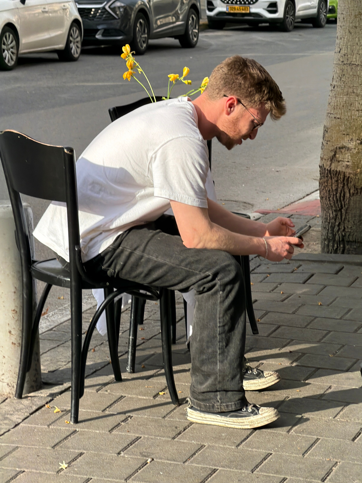 The image presents a daytime scene on an urban sidewalk in Tel-Aviv, Israel. A male individual, appearing to be in his 20s or 30s, is seated on a black wooden chair facing left, his body angled toward…read more