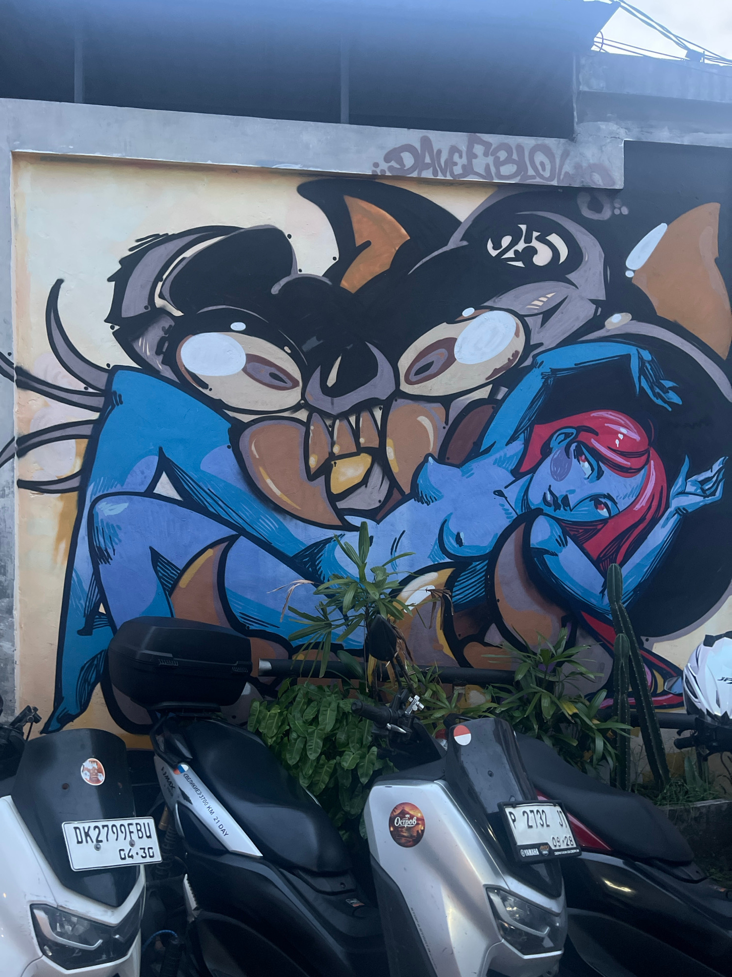 The image captures a mural on a wall in Tibubeneng, Indonesia, partially obscured by several parked scooters. The mural features a stylized depiction of a nude, blue-skinned woman with red hair, posed…read more