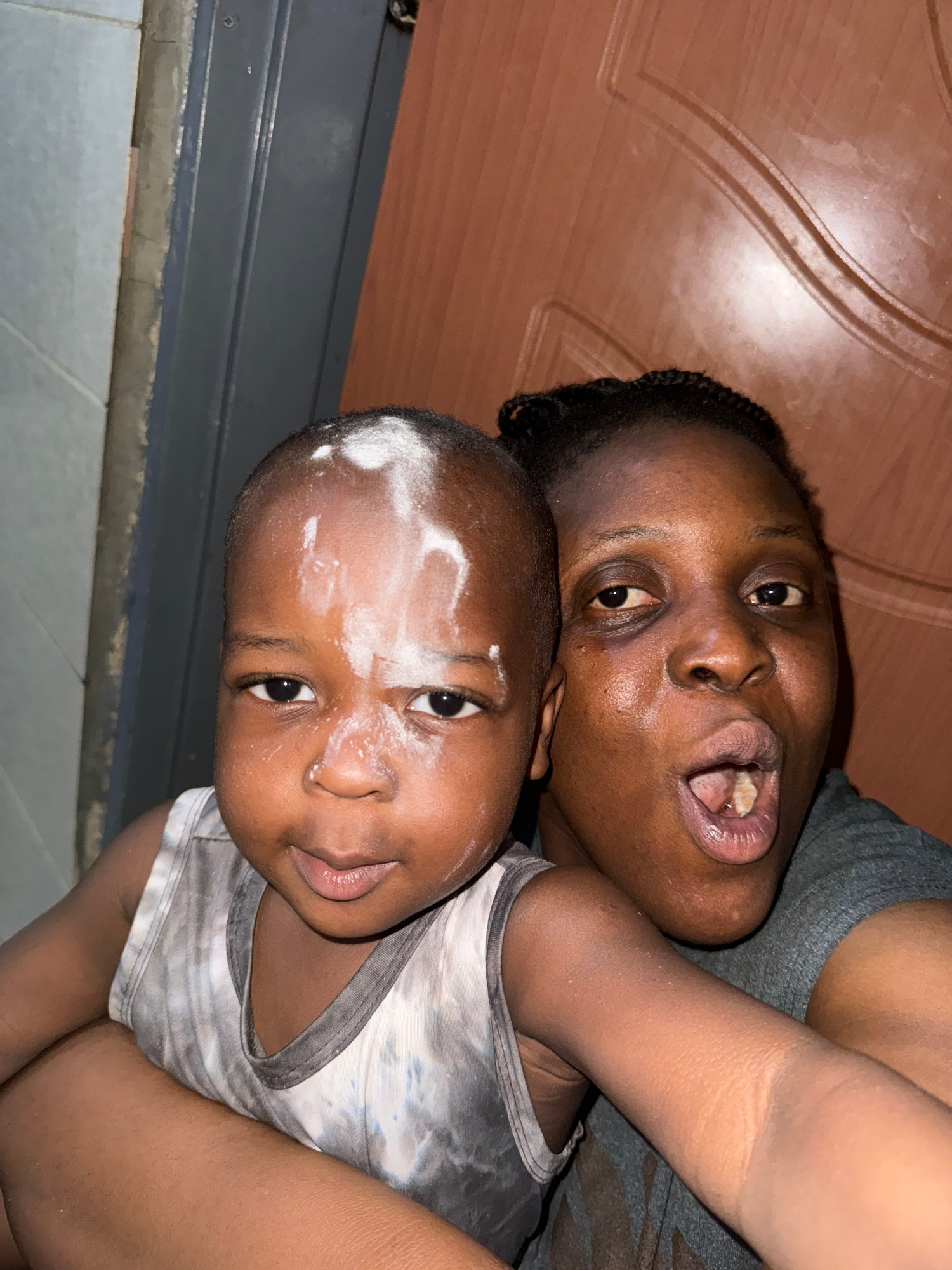 A close-up, slightly rotated photograph depicts a woman and a young child in what appears to be an indoor setting. The woman, dark-skinned, has her mouth open. The child, who is also dark-skinned, has…read more